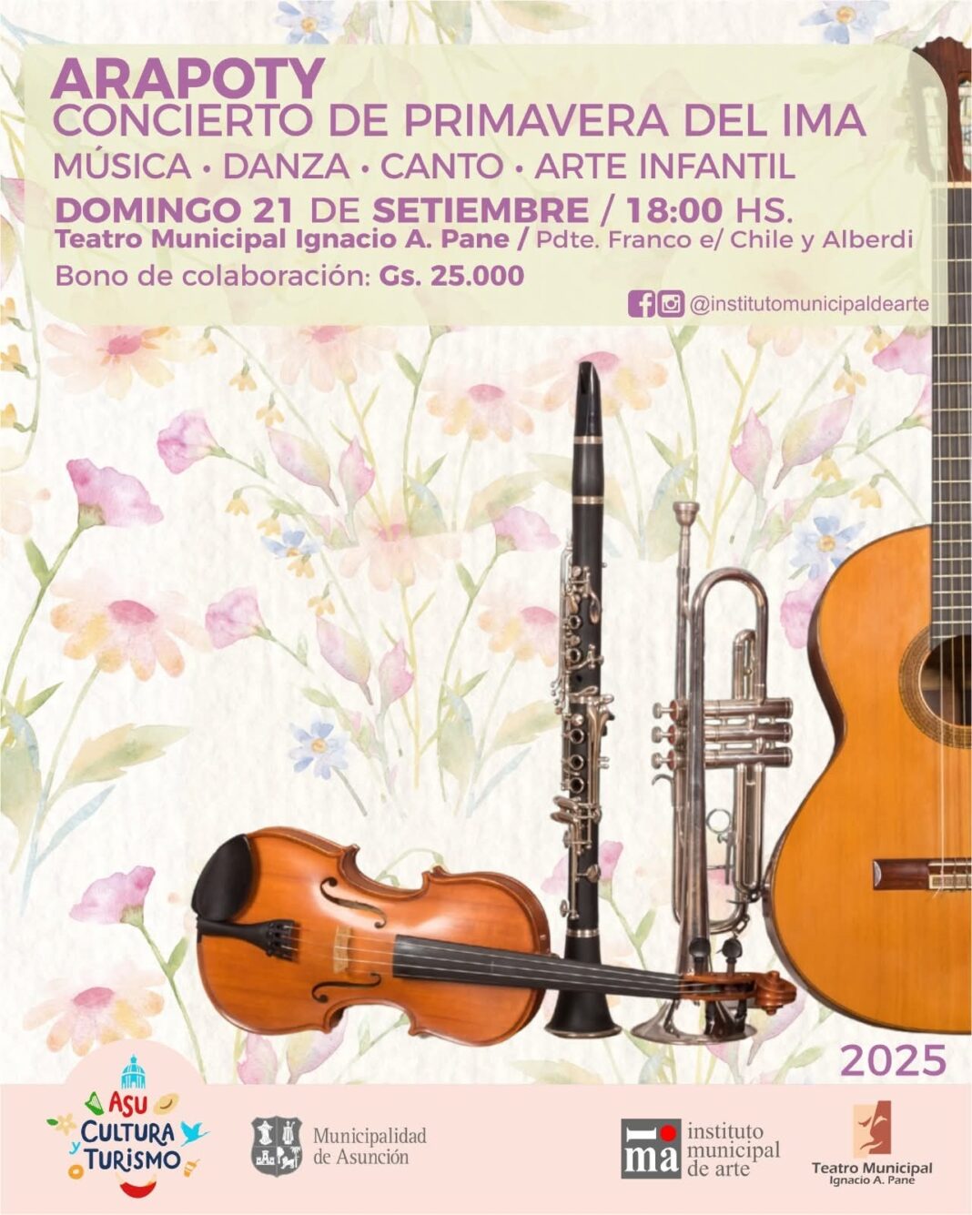 A través del concierto de primavera “Arapoty”, organizado por el Instituto Municipal de Arte (IMA), Luz María Bobadilla, directora de la institución, invitó a la ciudadanía a participar en el evento que se realizará este domingo 21 de septiembre a las 18:00 horas en el Teatro Municipal de Asunción, «Ignacio A Pane», sito en Presidente Franco entre Alberdi y Chile. Para la actividad, se prevé un bono de colaboración de Gs. 25.000.