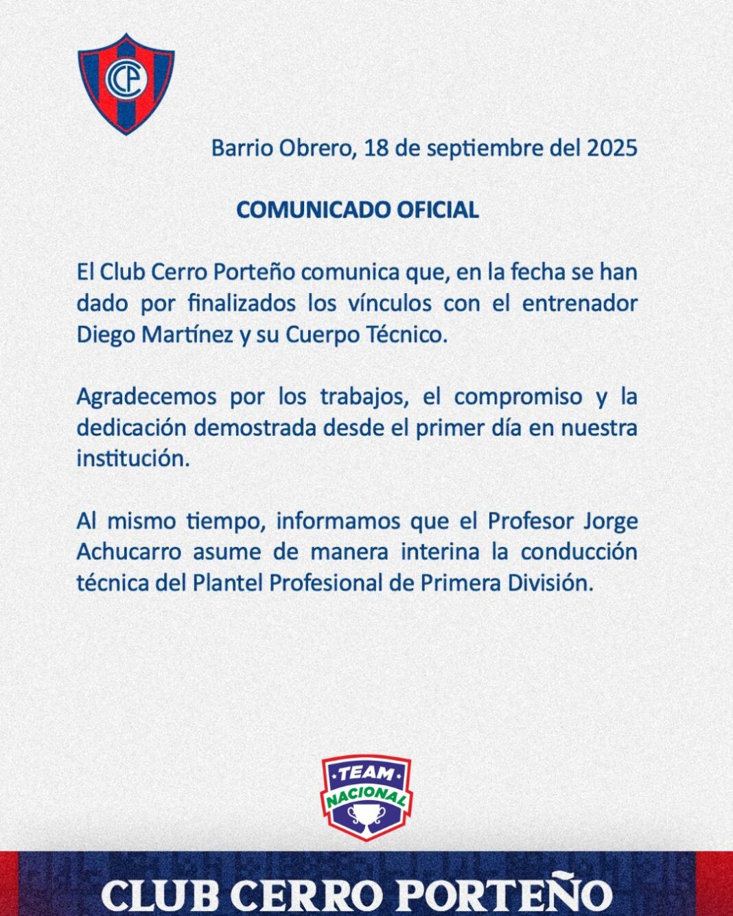 Tras finalizar su tarea al frente de la dirección técnico del plantel de primera del club Cerro Porteño, el entrenador argentino Diego Martínez, la directiva de la institución confirmó al ex futbolista Jorge Achucarro de manera interina como responsable del conjunto azulgrana en este tramo del torneo Clausura.