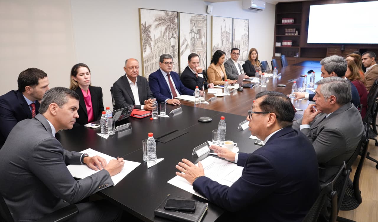 El presidente Santiago Peña reunido con miembros de su gabinete, en marco del anuncio de la expansión del Programa Hambre Cero. Foto: Ministerio de Desarrollo Social.