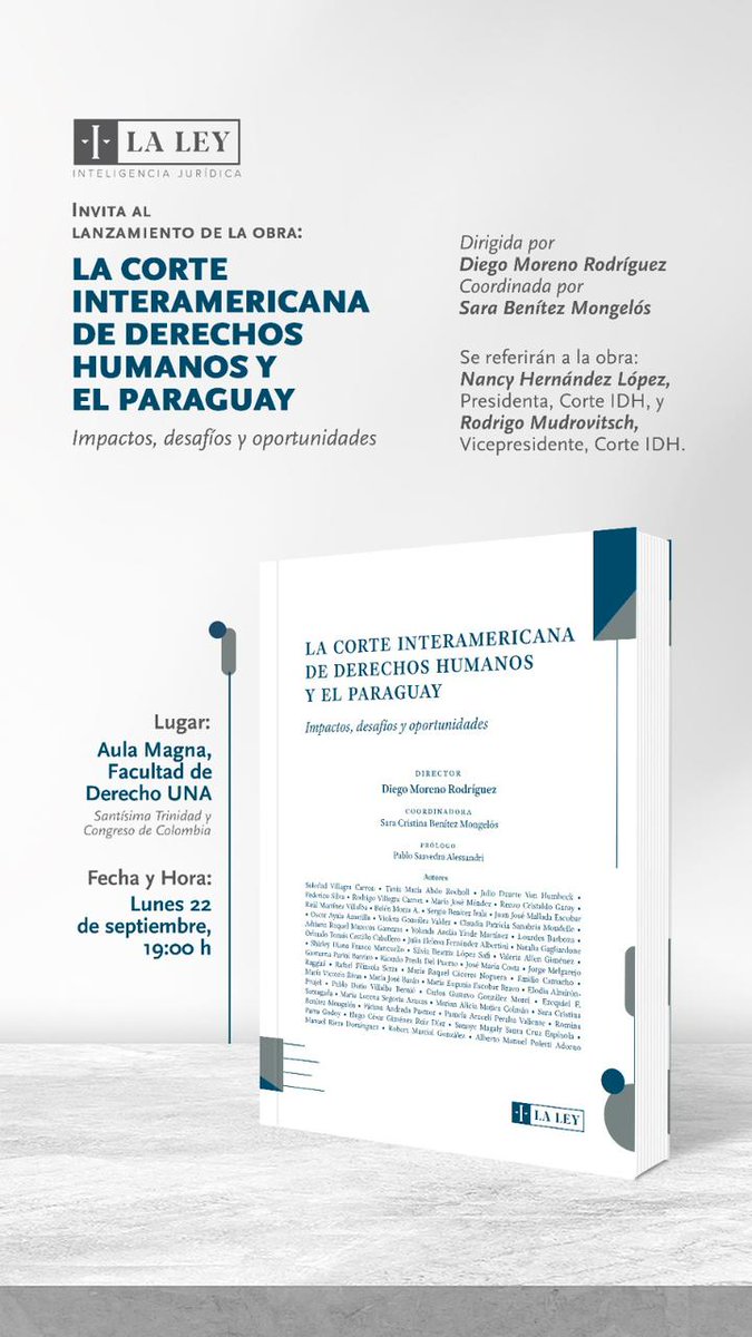 La obra » La Corte Interamericana de Derechos Humanos y el Paraguay», se presentará este lunes 22 de septiembre a las 19:00 horas en el Aula Magna de Derecho de la UNA, informó el juez de la Corte Interamericana de Derechos Humanos.