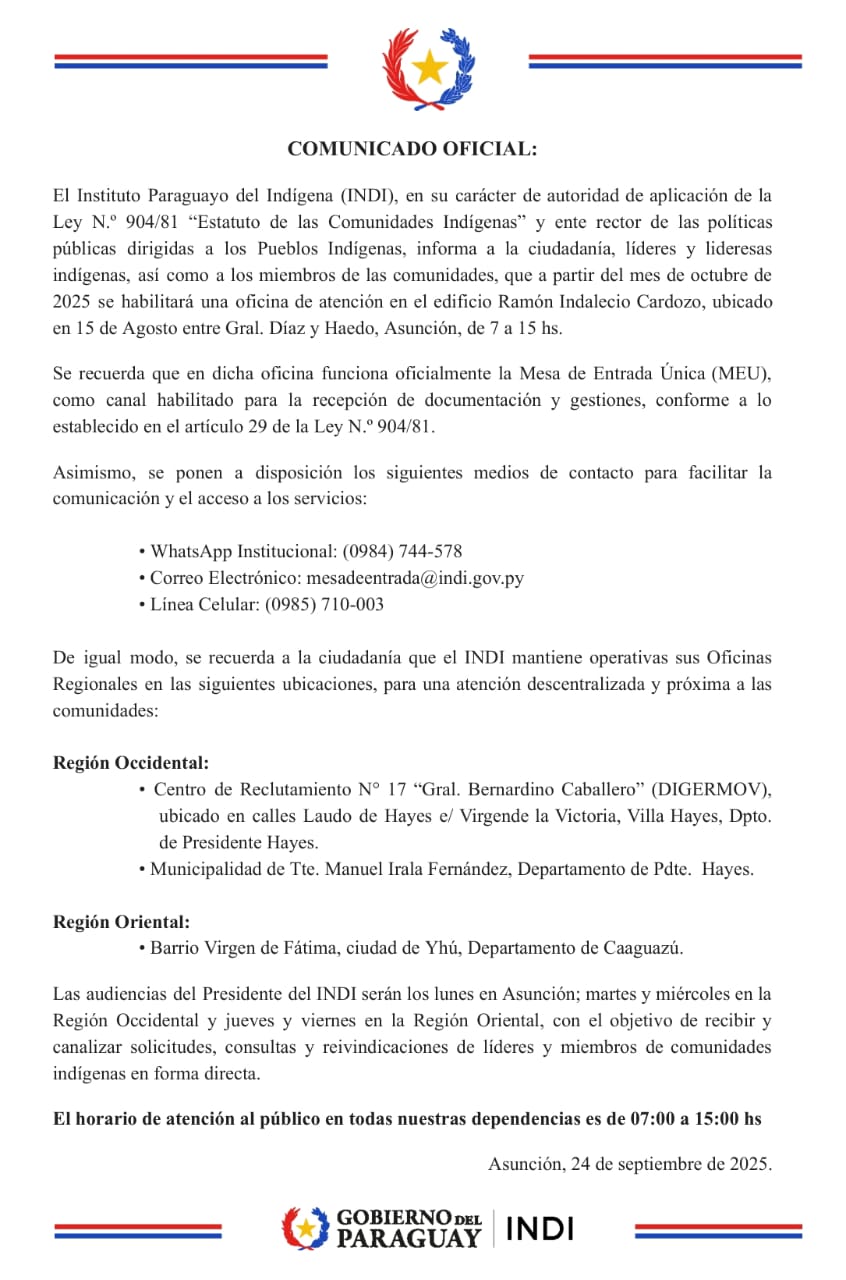 El Instituto Nacional del Indígena, comunica la instalación de una oficina de atención en Asunción, informó este jueves el presidente del INDI, Juan Ramón Benegas.