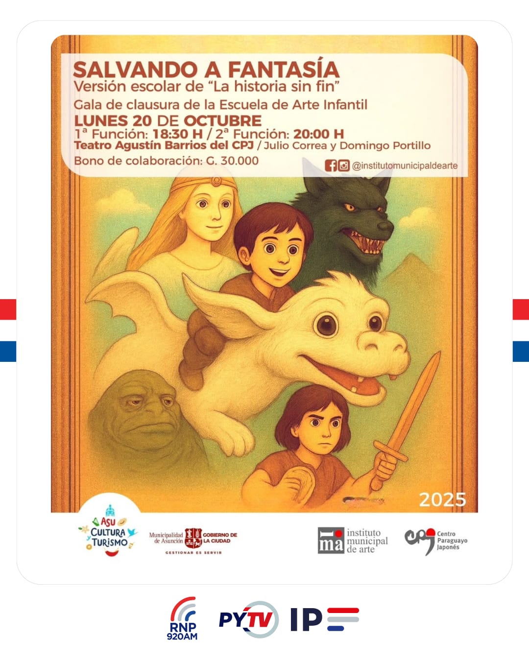 La Escuela de Arte Infantil del IMA presenta su gala de clausura con una versión escolar de “La historia sin fin”, el próximo 20 de octubre en dos funciones en el Teatro Agustín Barrios del Centro Paraguayo Japonés, sito en Julio Correa y Domingo Portillo. La primera será a las 18:30 y la segunda a las 20:00 horas