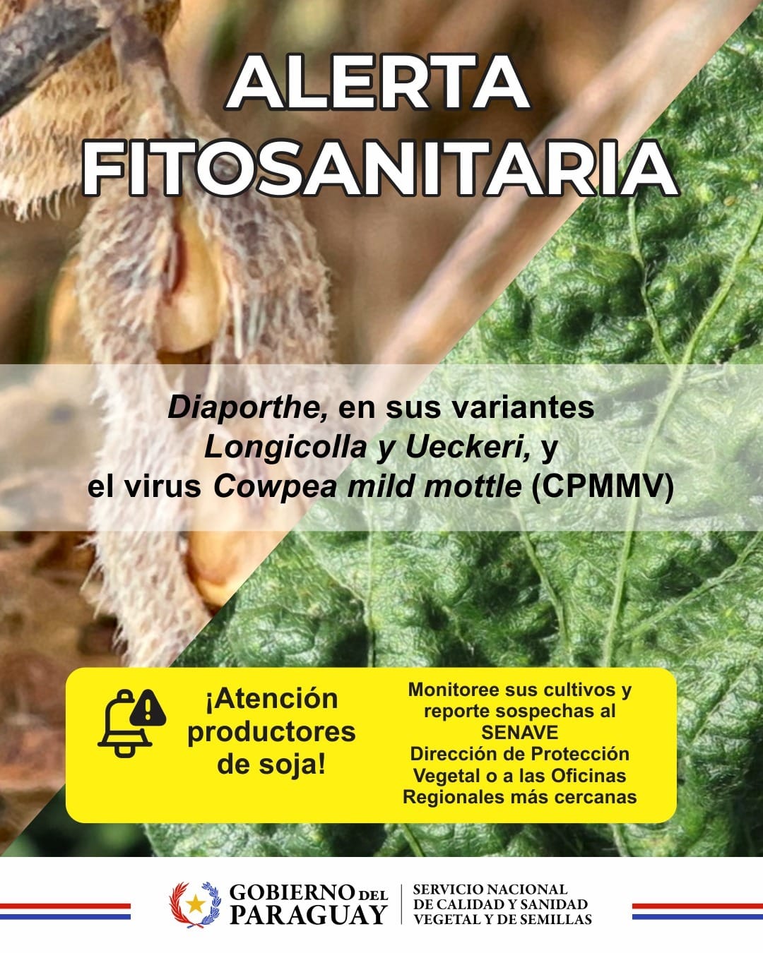 El Servicio Nacional de Calidad y Sanidad Vegetal y de Semillas SENAVE, alerta a productores de soja sobre la presión de ingreso de plagas dañinas para el cultivo del mencionado rubro, informó este jueves la jefa del departamento de Vigilancia Fitosanitaria del Senave, ingeniera Carolina Garay.