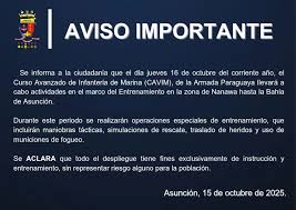 Finalmente, dijo que la Armada Paraguaya enfatiza que, si bien se utilizan cartuchos de fogueo que producen ruido, las actividades no representan riesgo para la ciudadanía que fue alertada previamente, mediante un comunicado sobre estos movimientos en la zona de entrenamiento.