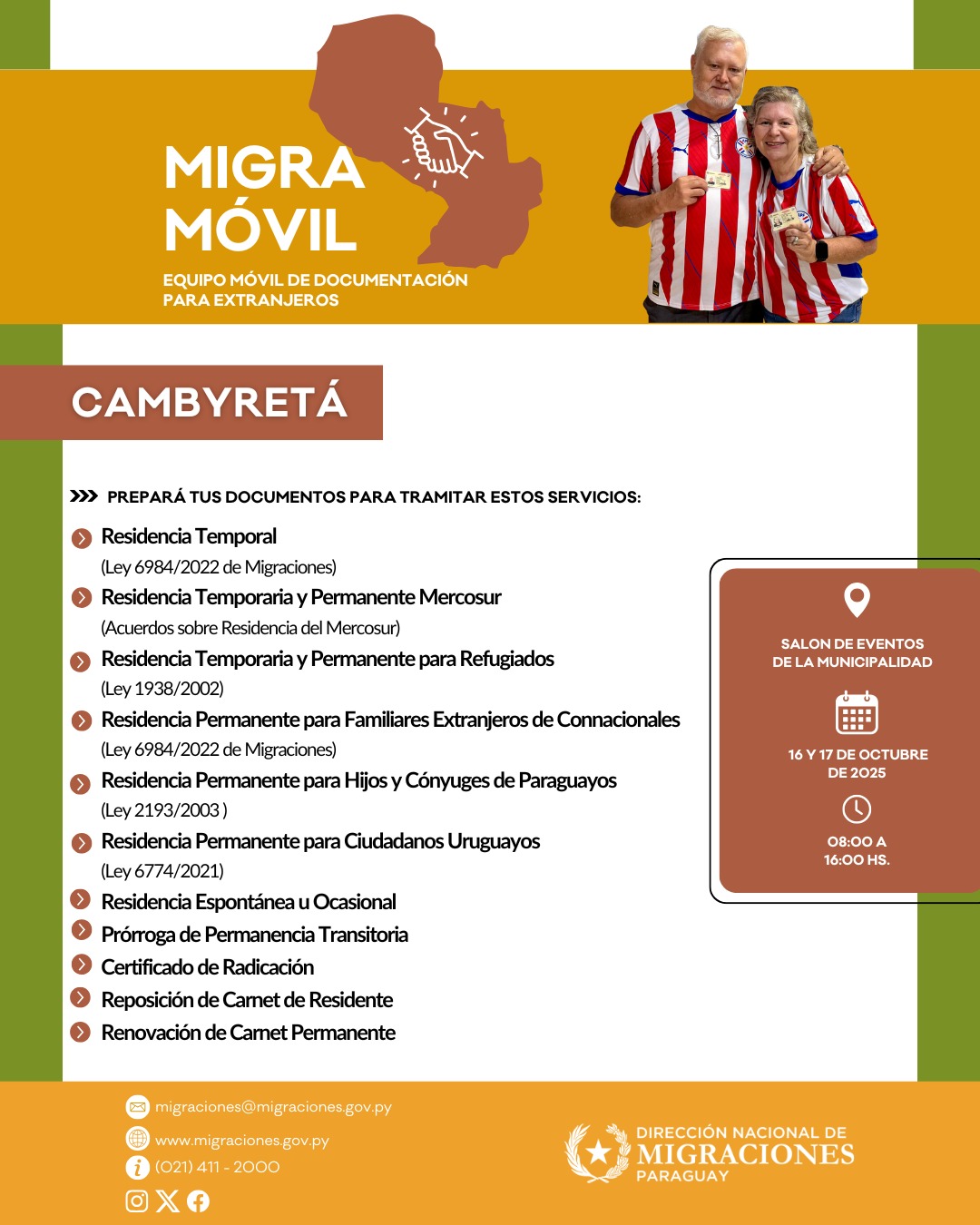 Con la finalidad que los familiares directos de connacionales puedan acceder a beneficios presentando el Certificado de Repatriación otorgado por la SEDERREC, el Migramóvil llega a la ciudad de Cambyretá, informó este jueves el jefe del Departamento de Equipos Móviles de la Dirección General de Extranjeros de Migraciones, Javier Vera.