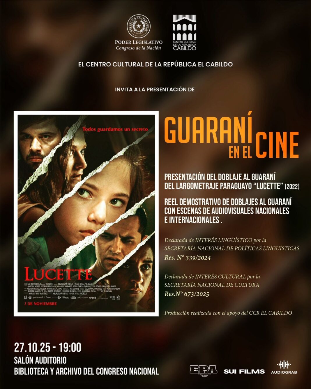 la presentación del ciclo denominado “Guaraní en el Cine”, ofrecerá la proyección del largometraje paraguayo Lucette (2022) con doblaje al idioma paraguayo, este lunes 27 de octubre, a las 19:00, en el Salón Auditorio de la Biblioteca y Archivo del Congreso Nacional (Río Ypané y Paulino Alén Benítez, Asunción), con entrada libre y gratuita.