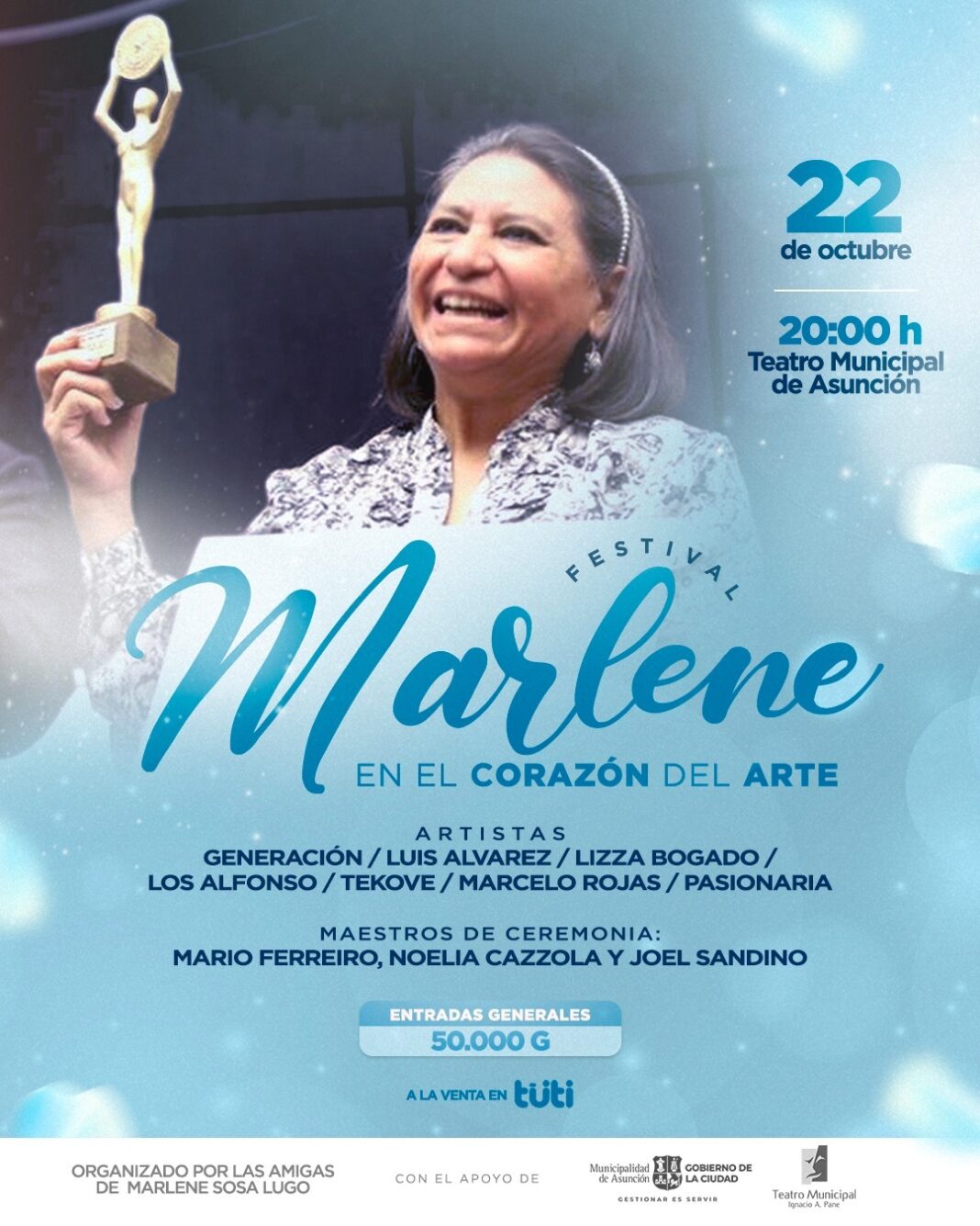 Mencionó que las entradas cuestan 50.000 guaraníes y están a la venta a través de la plataforma Tutti. Afirmó que este evento está organizado por los amigos de Marlene, con el apoyo del Teatro Municipal Ignacio A. Pane y la Municipalidad de Asunción.