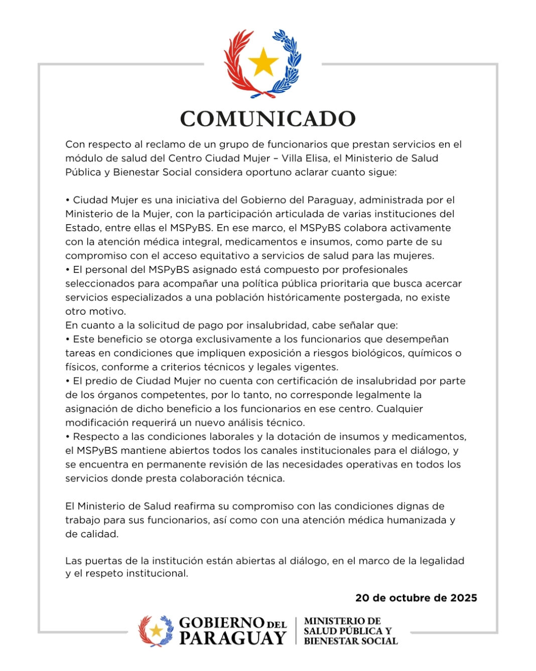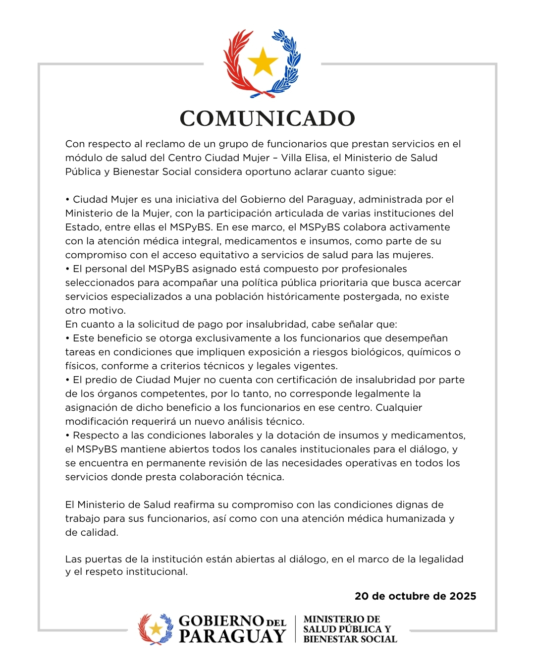 El jefe de Gabinete del Ministerio de Salud, Juan Marcelo Estigarribia, abordó el reclamo de unas 33 funcionarias de la cartera que prestan servicios en el módulo de salud del Centro Ciudad Mujer en Villa Elisa, quienes solicitan el pago en concepto de insalubridad. El funcionario explicó que existe una «barrera legal» que impide acceder al beneficio, ya que la normativa exige una declaración previa de insalubridad del lugar por parte del Ministerio de Trabajo.
