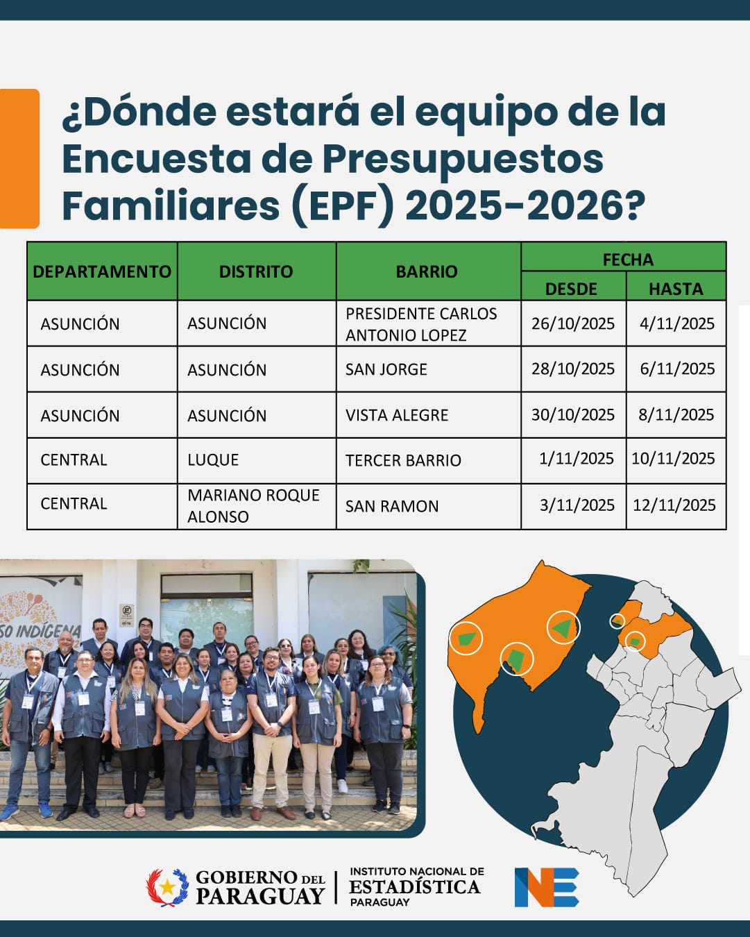 La recolección de datos, a cargo del INE, inició el 6 de octubre de este año y se extenderá hasta septiembre de 2026. Se estima visitar aproximadamente 3060 viviendas distribuidas entre Asunción (cerca de 1440 hogares) y 11 municipios del departamento Central (alrededor de 1600 hogares), incluyendo ciudades como Luque, Limpio, San Lorenzo y Capiatá. La selección de las viviendas se realiza de forma aleatoria.