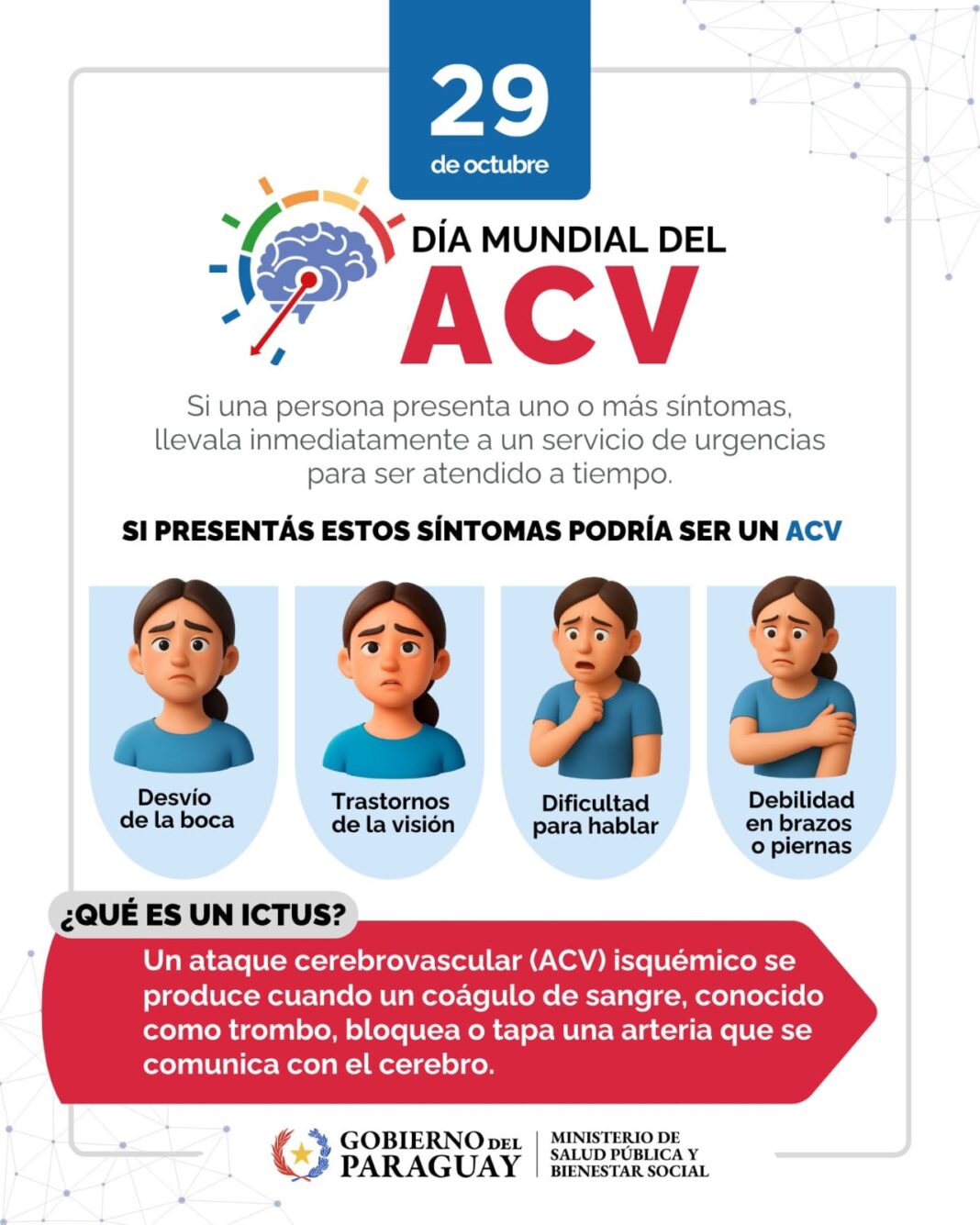 Recordó que el lema de este año es: Cada minuto cuenta”. Actuar rápido puede salvar vidas. Además explicó que el Ministerio de Salud Pública y Bienestar Social, recomienda que si se sospecha de un ataque cerebrovascular, es crucial llegar al hospital dentro de las 4 horas y media posteriores a la aparición de los síntomas.