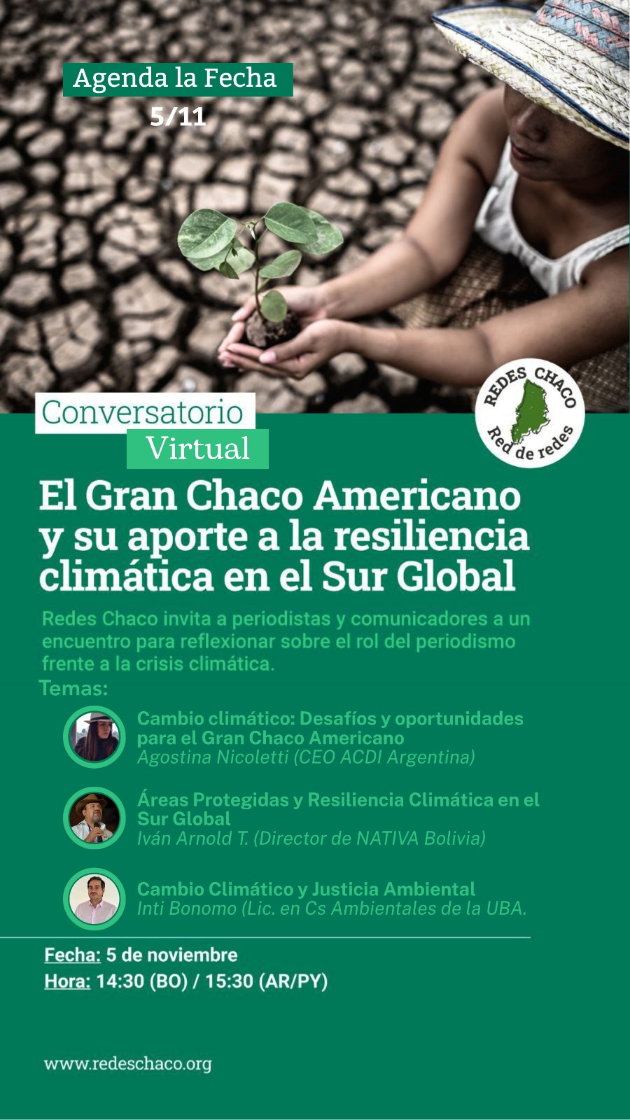 El Conversatorio virtual  denominado «El  Gran Chaco Americano y su Aporte a la Resiliencia Ambiental, se realizará este miércoles 5 de noviembre, informó este lunes la coordinadora de la Red de Periodistas por el Gran Chaco – Redes Chaco, ingeniera Inga Olmos.