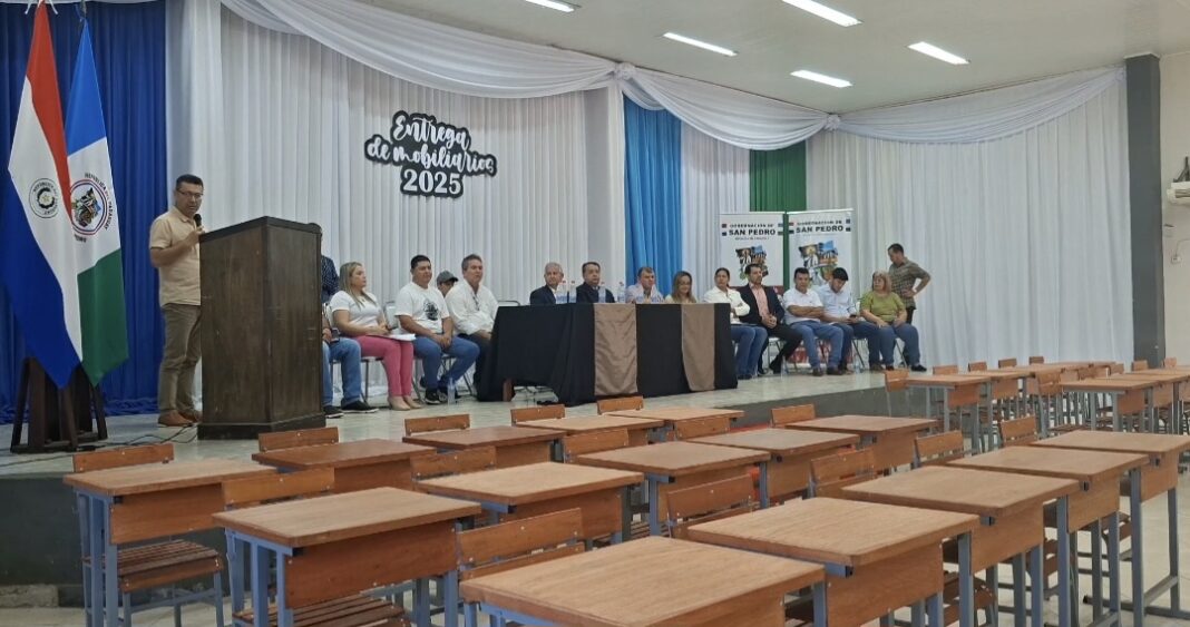 Durante un acto realizado este jueves en el salón auditorio Pa’i Valenzuela de la Gobernación de San Pedro, se realizó la entrega simbólica de un total de 1.150 sillas y mesas tipo pupitre, destinadas a 74 instituciones educativas de distintos distritos del segundo departamento.