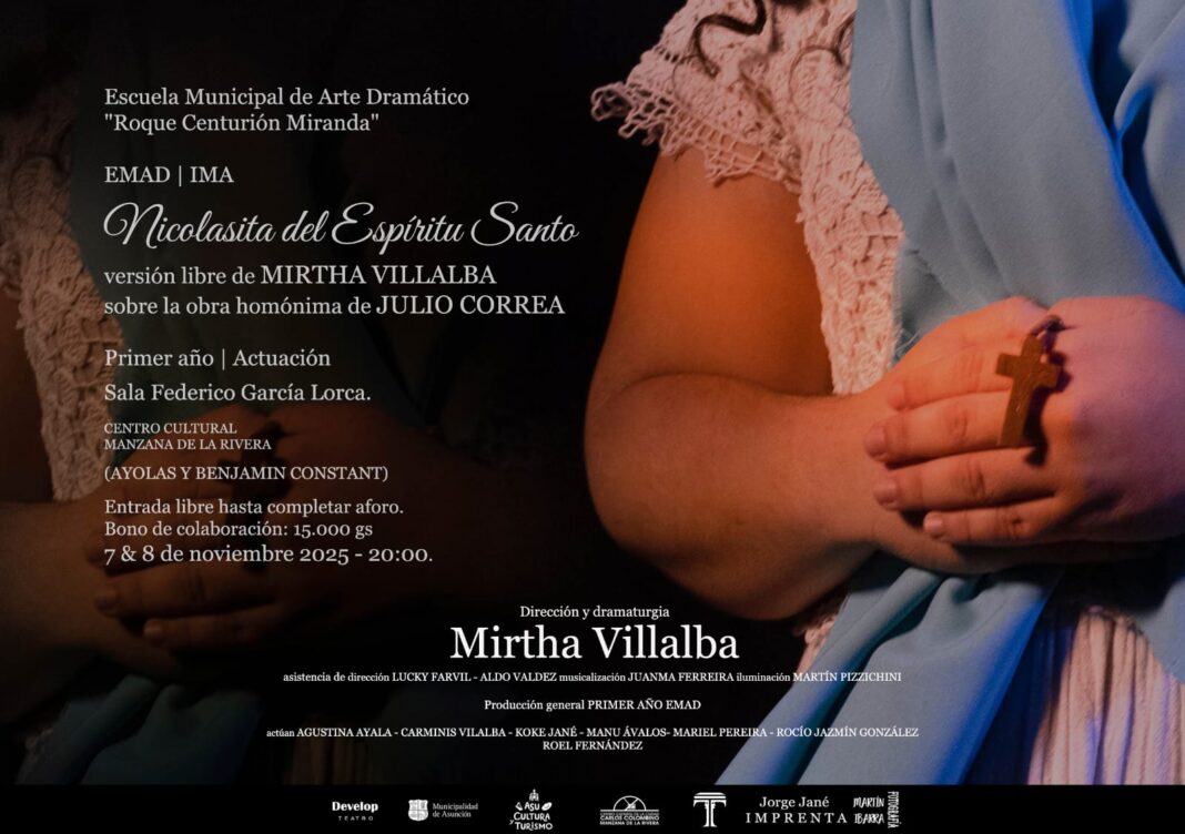 La Escuela Municipal de Arte Dramático “Roque Centurión Miranda” (EMAD) del Instituto Municipal de Arte (IMA) presenta la obra Nicolasita del Espíritu Santo, versión libre de Mirtha Villalba sobre la obra homónima de Julio Correa.