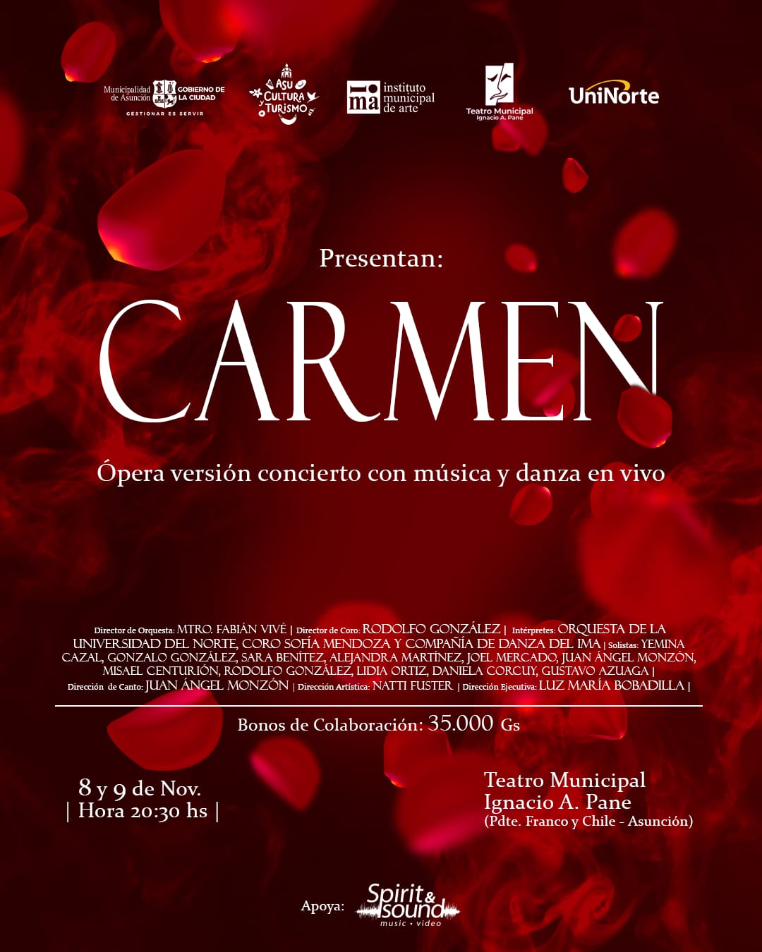 El Instituto Municipal de Arte y la Universidad del Norte presentan la ópera “Carmen” de Bizet, en versión concierto con música y danza en vivo, informó este viernes la directora del IMA, Luz María Bobadilla.