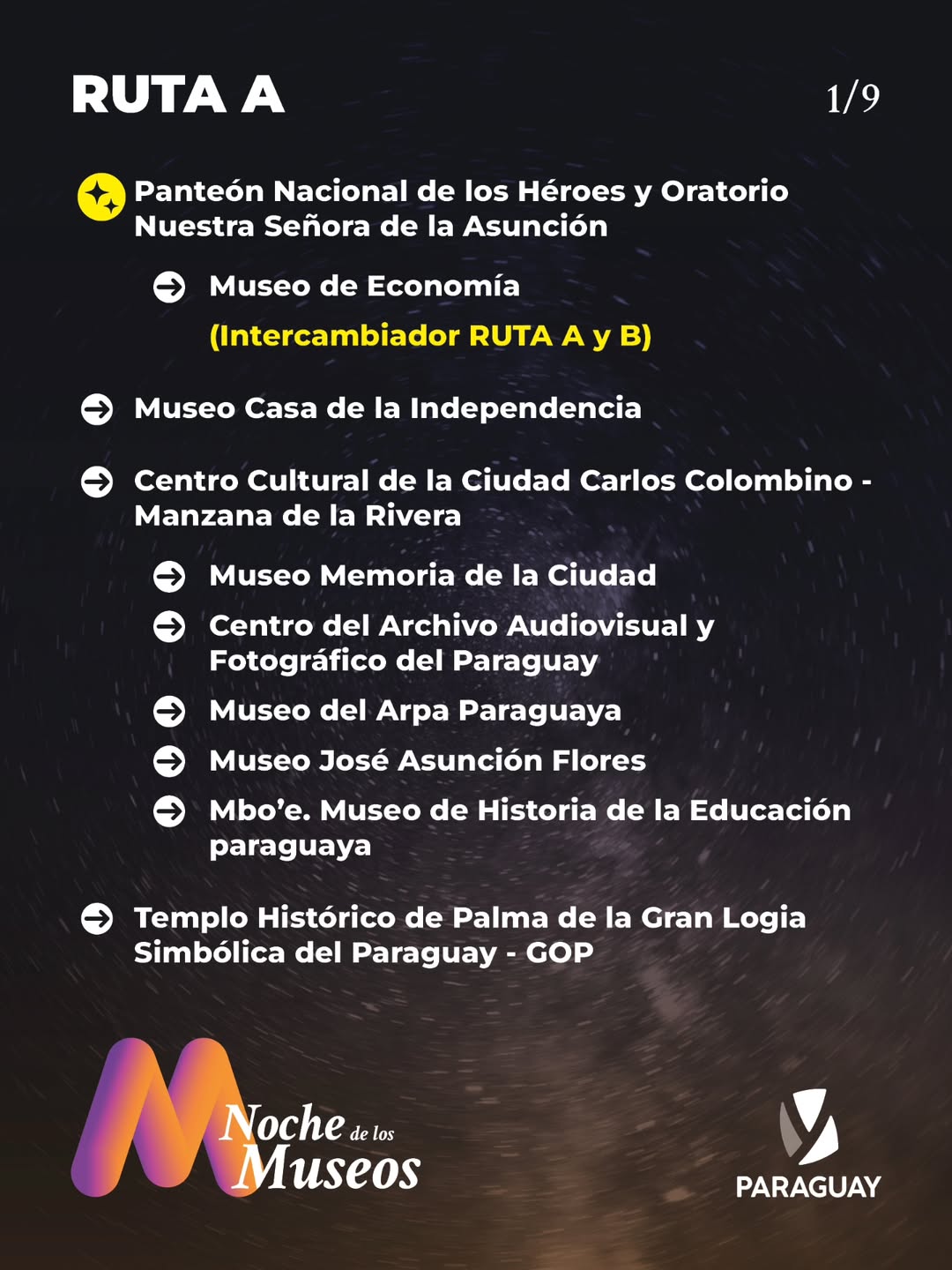La novena edición de la Noche de los Museos Paraguay se realiza este sábado 15 de noviembre desde las 18:00 horas, informó la directora de proyectos de la Asociación, Gloria Velilla.