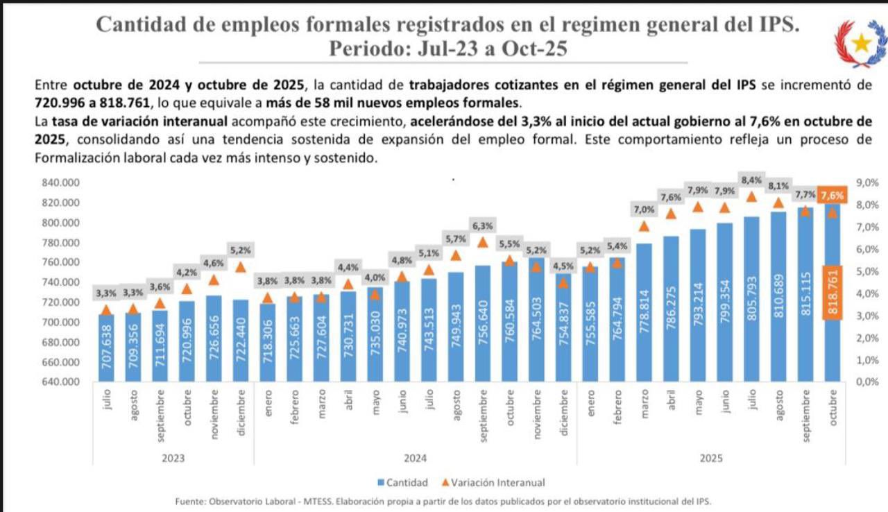 El Ministerio de Trabajo, Empleo y Seguridad Social (MTESS) anunció un récord histórico de formalización, alcanzando los 818.000 cotizantes totales al IPS.