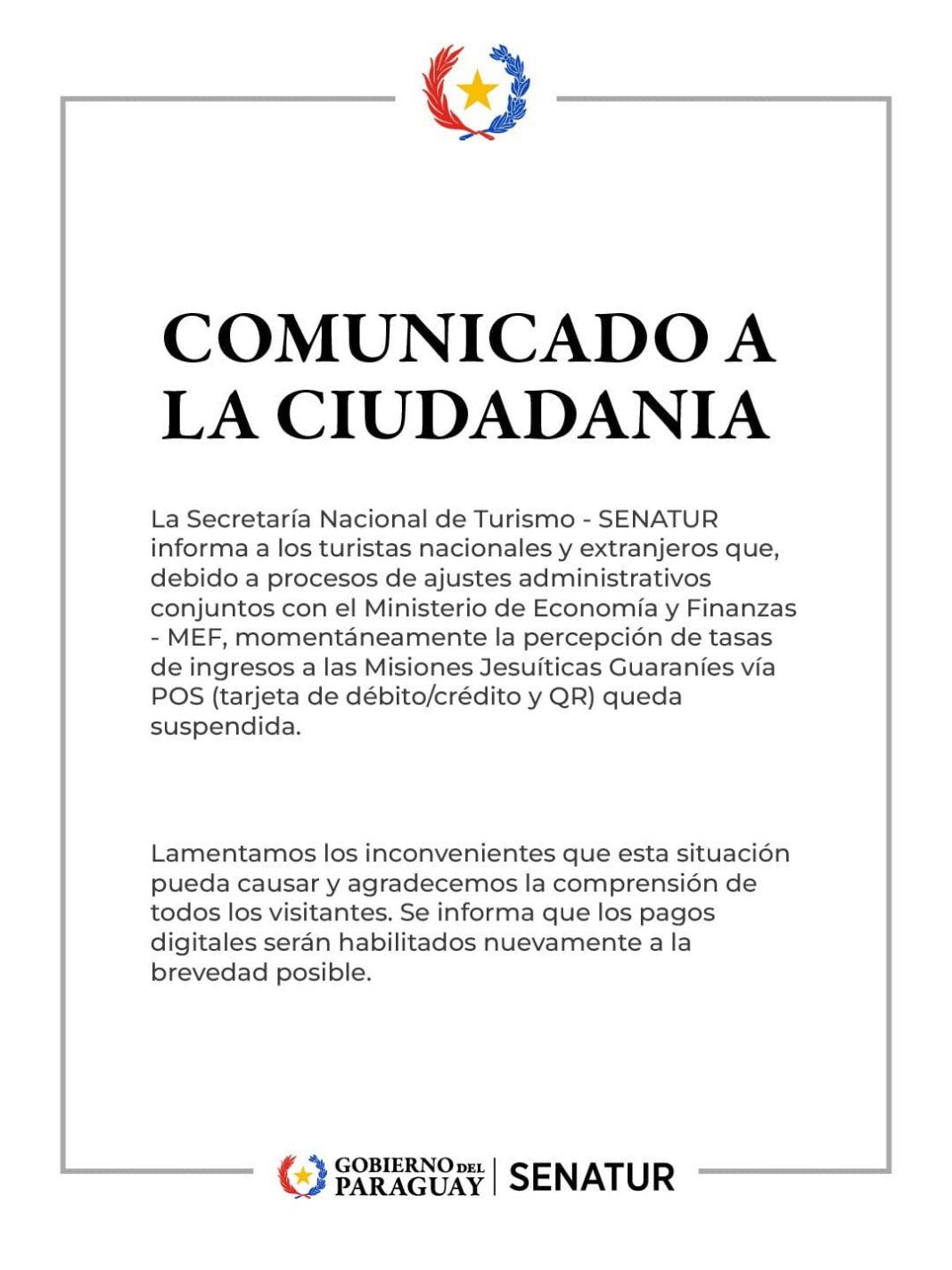 La Secretaría Nacional de Turismo informa que, debido a ajustes administrativos realizados junto al Ministerio de Economía y Finanzas, los pagos digitales (POS y QR) para el ingreso a las Misiones Jesuíticas Guaraníes se encuentran temporalmente suspendidos, explicó este martes la directora financiera de Senatur, Virna López.