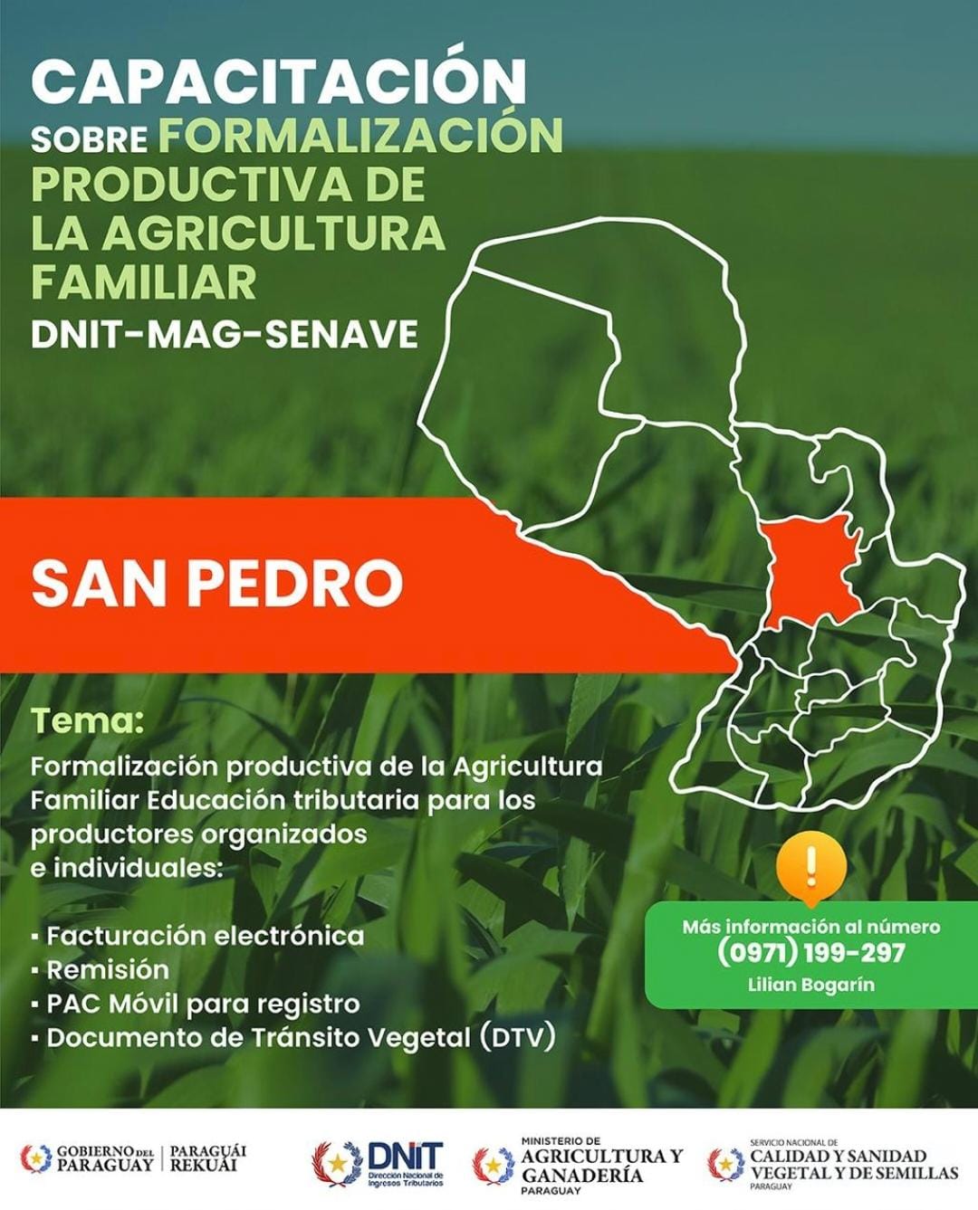 La capacitación sobre formalización productiva de la agricultura familiar, se realizará en el departamento de San Pedro, informó este miércoles el gerente general de Impuestos Internos de la DNIT, Ever Otazú.