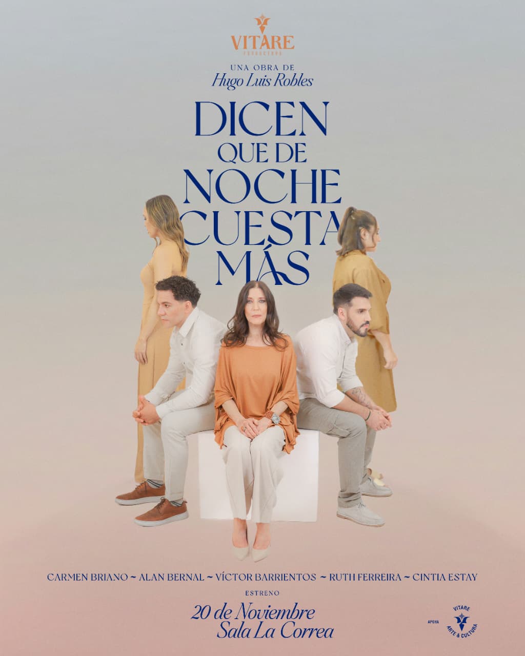 El jueves 20 de noviembre a las 21:00 horas, en la Sala La Correa, se estrenará la nueva obra escrita y dirigida por Hugo Luis Robles titulada: “DICEN QUE DE NOCHE CUESTA MÁS”.