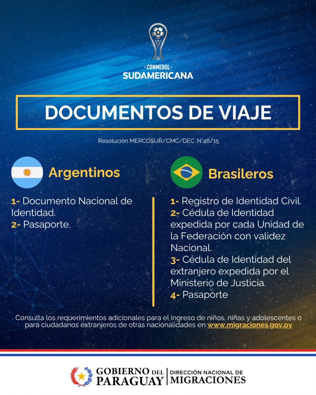 La Dirección de Migraciones, exhorta a los hinchas de Lanús de la Argentina y del Atlético Mineiro de Brasil, a cumplir las exigencias migratorias para ingresar a Paraguay y formar parte de la fiesta del fútbol.