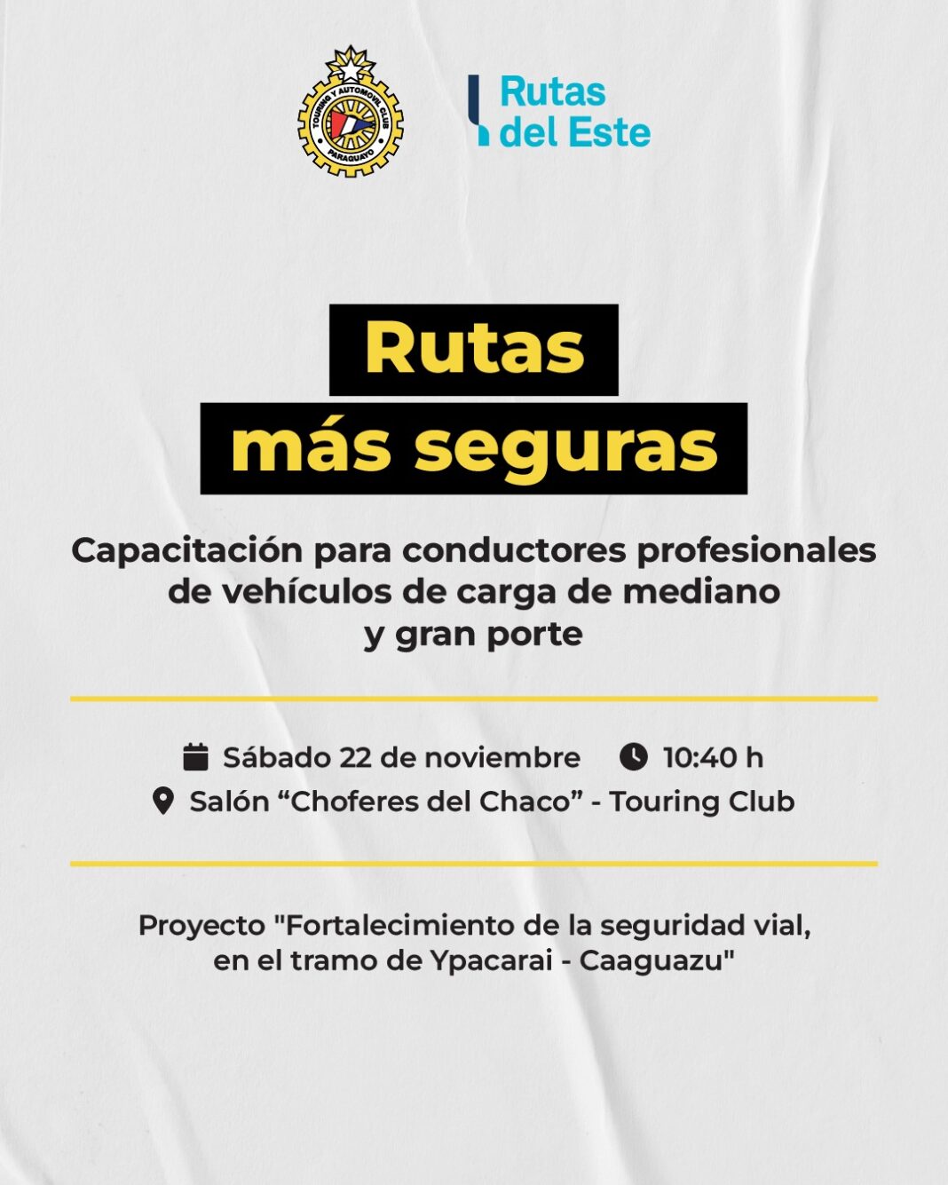 El Touring y Automóvil Club Paraguayo (TACPY) realizará este sábado la jornada de clausura del proyecto “Fortalecimiento de la Seguridad Vial en el tramo Ypacaraí–Caaguazú”, una iniciativa que cuenta con el apoyo de Rutas del Este y desarrollada desde junio de este año.