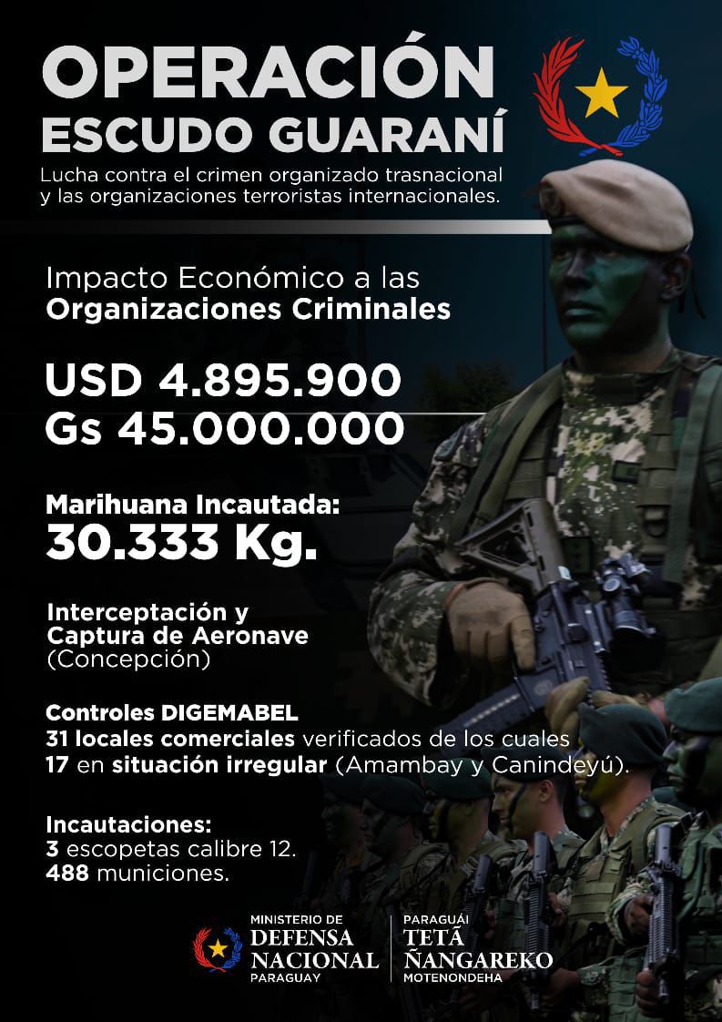 En el marco de la lucha contra el crimen organizado transnacional y las organizaciones terroristas internacionales, el Presidente de la República y Comandante en Jefe de las Fuerzas Armadas, Santiago Peña Palacios, ordenó la ejecución Operación Escudo Guaraní, recordó este lunes el ministro de Defensa Nacional, Óscar González.