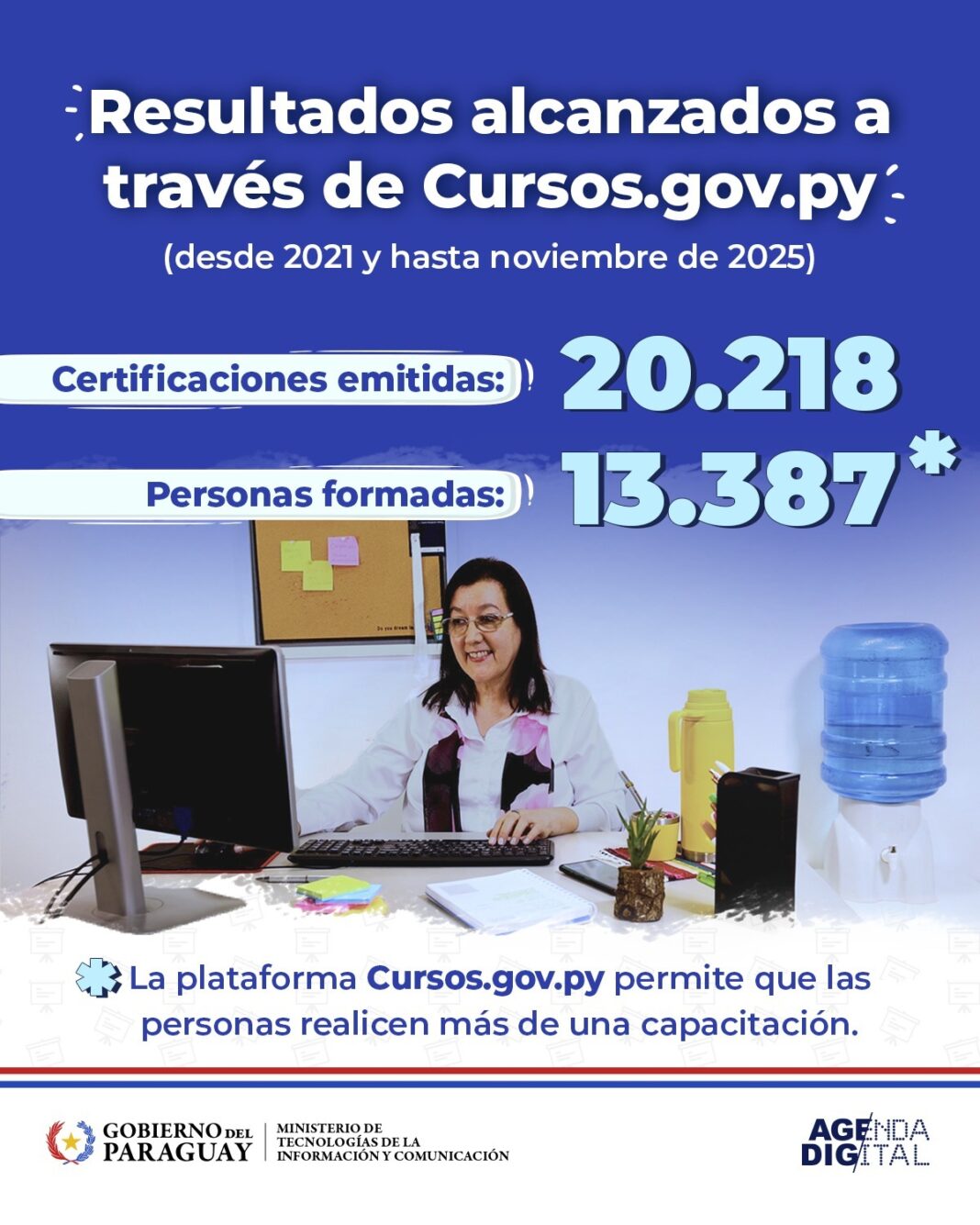 Finalmente, dijo que las ofertas académicas se encuentran disponibles en www.cursos.gov.py, con el propósito de fortalecer las capacidades digitales de la ciudadanía, promover el acceso al conocimiento y reducir la brecha digital.