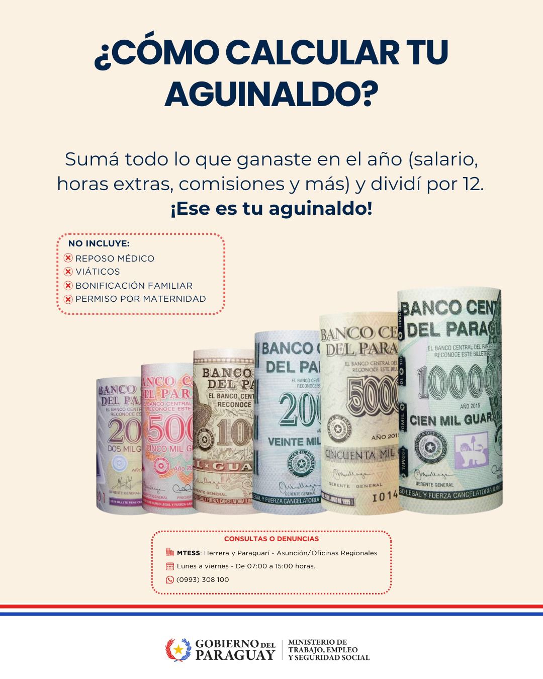 Llega fin de año y, con él, uno de los derechos más esperados por los trabajadores: el aguinaldo. Para que cada persona reciba el monto que realmente le corresponde, el Ministerio de Trabajo, Empleo y Seguridad Social (MTESS) explica de manera sencilla cómo realizar el cálculo según lo establecido en el Código Laboral Paraguayo.