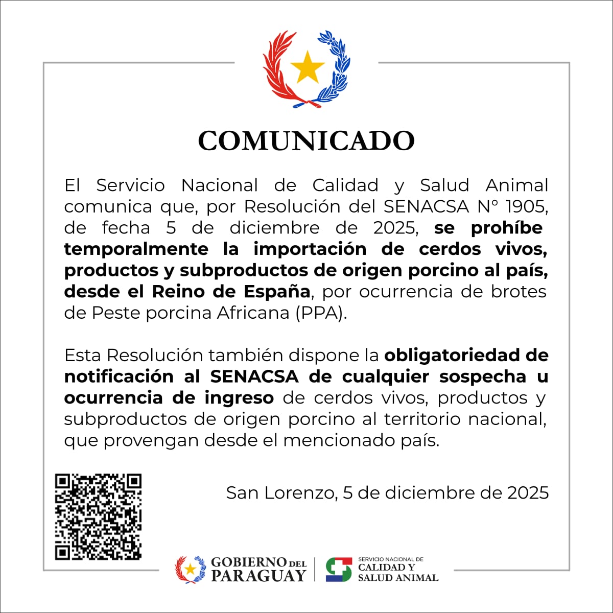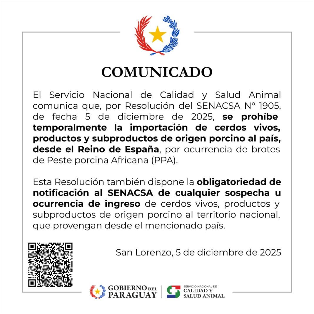 El Senacsa emitió la Resolución N°1.905, del 5 de diciembre de 2025, que prohíbe la importación de cerdos vivos y sus derivados desde España. La alerta se debe a que la PPA es una enfermedad no zoonótica (no afecta a humanos) que se propaga fácilmente cuando animales susceptibles tienen acceso a alimentos contaminados.