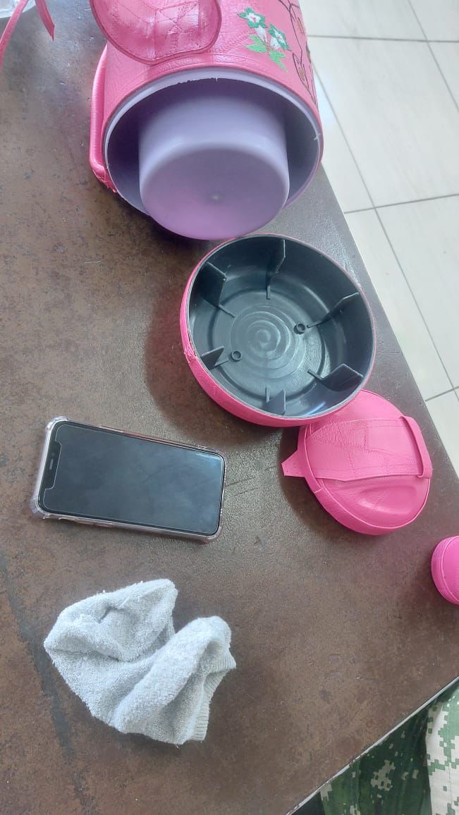 Explicó que durante el riguroso proceso de verificación del contenido, desarrollado por el personal militar de guardia en presencia del Señor García, se detectó un celular de alta gama marca iPhone oculto dentro del termo.