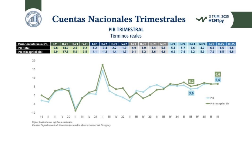 El Banco Central del Paraguay, informó que la economía nacional registró un crecimiento acumulado del 6,5% del Producto Interno Bruto (PIB) hasta el tercer trimestre del año, impulsado principalmente por el dinamismo de los sectores de agricultura y servicios.