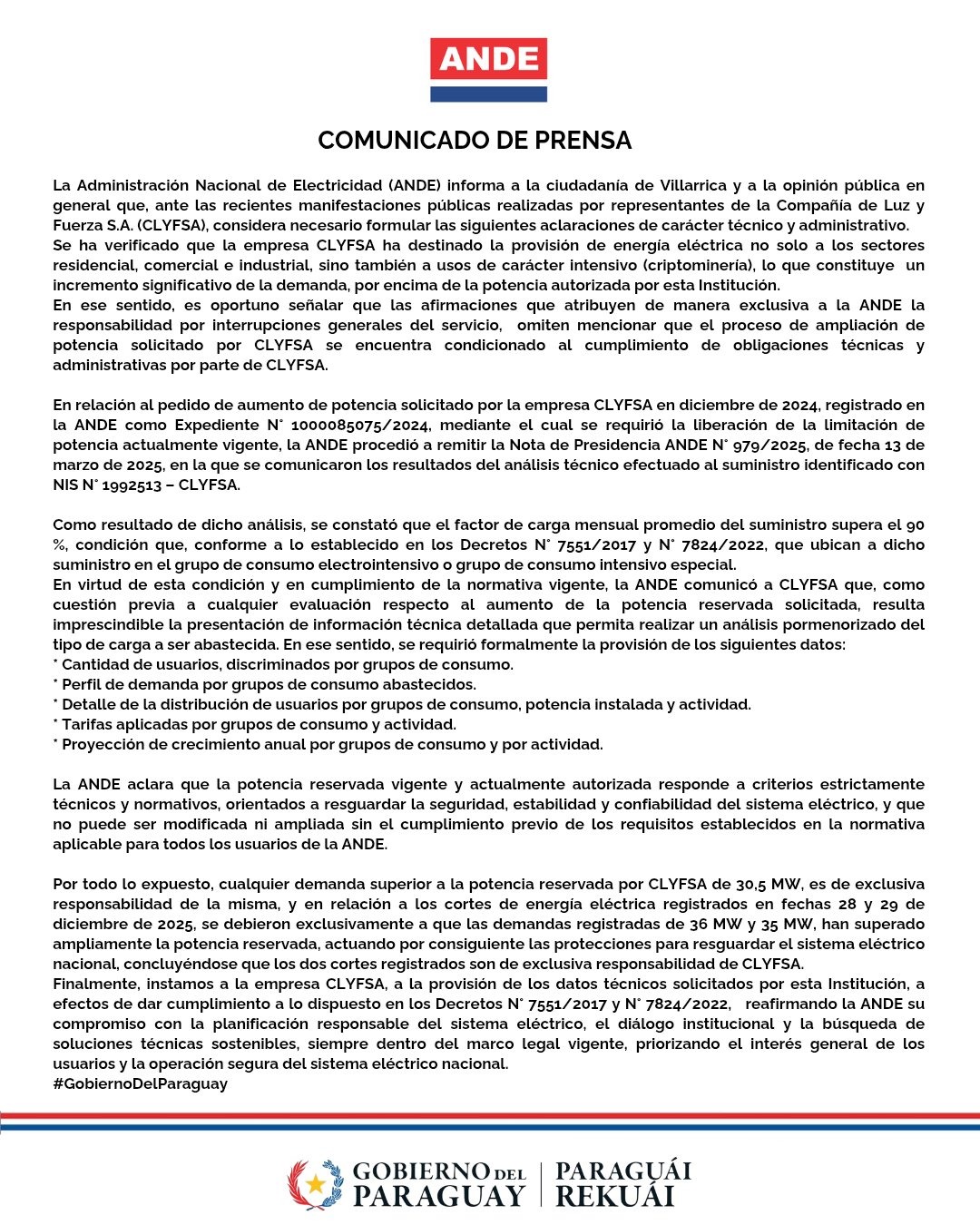 El ingeniero Hugo Rolón, gerente comercial de la ANDE, informó que los recientes cortes en Guairá se debieron a que la empresa CLYFSA superó ampliamente su potencia contratada. Las mediciones técnicas revelaron que la proveedora alcanzó los 36 MW, sobrepasando en un 20% el límite de 30,5 MW permitido por el sistema interconectado nacional.