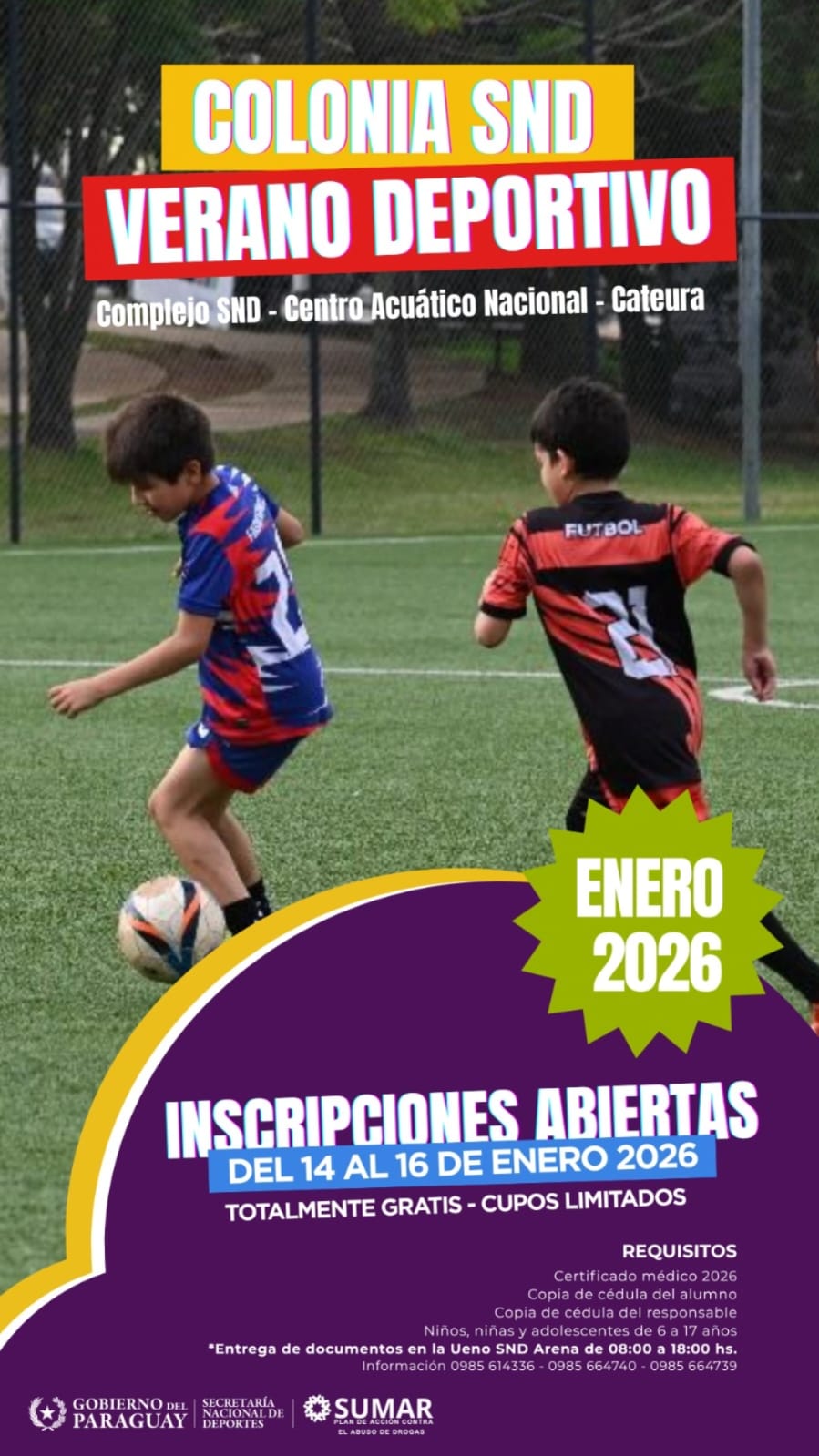 La Secretaría Nacional de Deportes abre oficialmente las inscripciones para la Colonia de Vacaciones, en el marco del proyecto Verano Deportivo, informó este martes el coordinador Verano Deportivo del SND, Axel Gamarra.