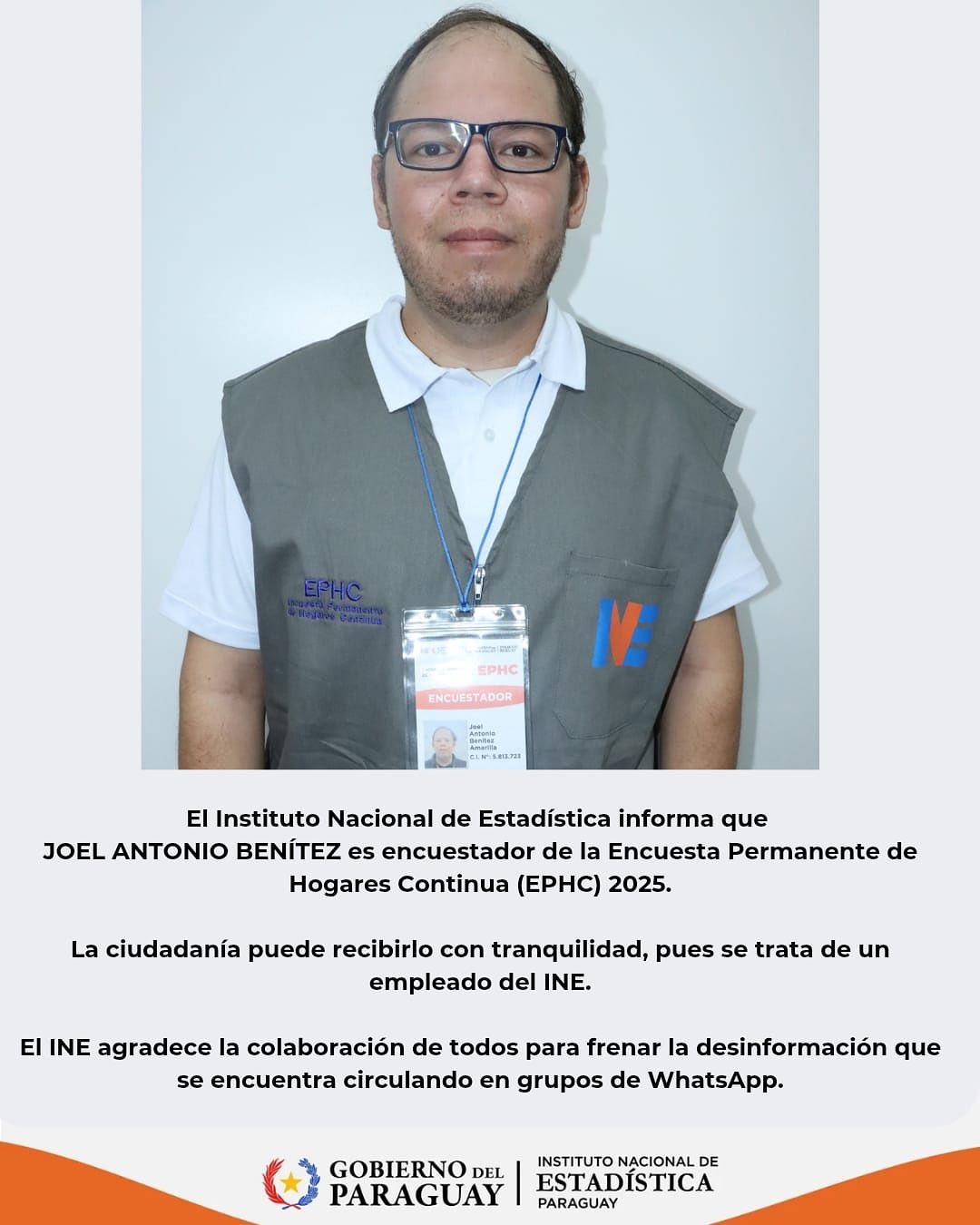 También, informó que Joel Benítez es uno de los encuestadores que trabaja en el operativo de campo de la Encuesta Permanente de Hogares Continua (EPHC), que se realiza durante todo el año.
