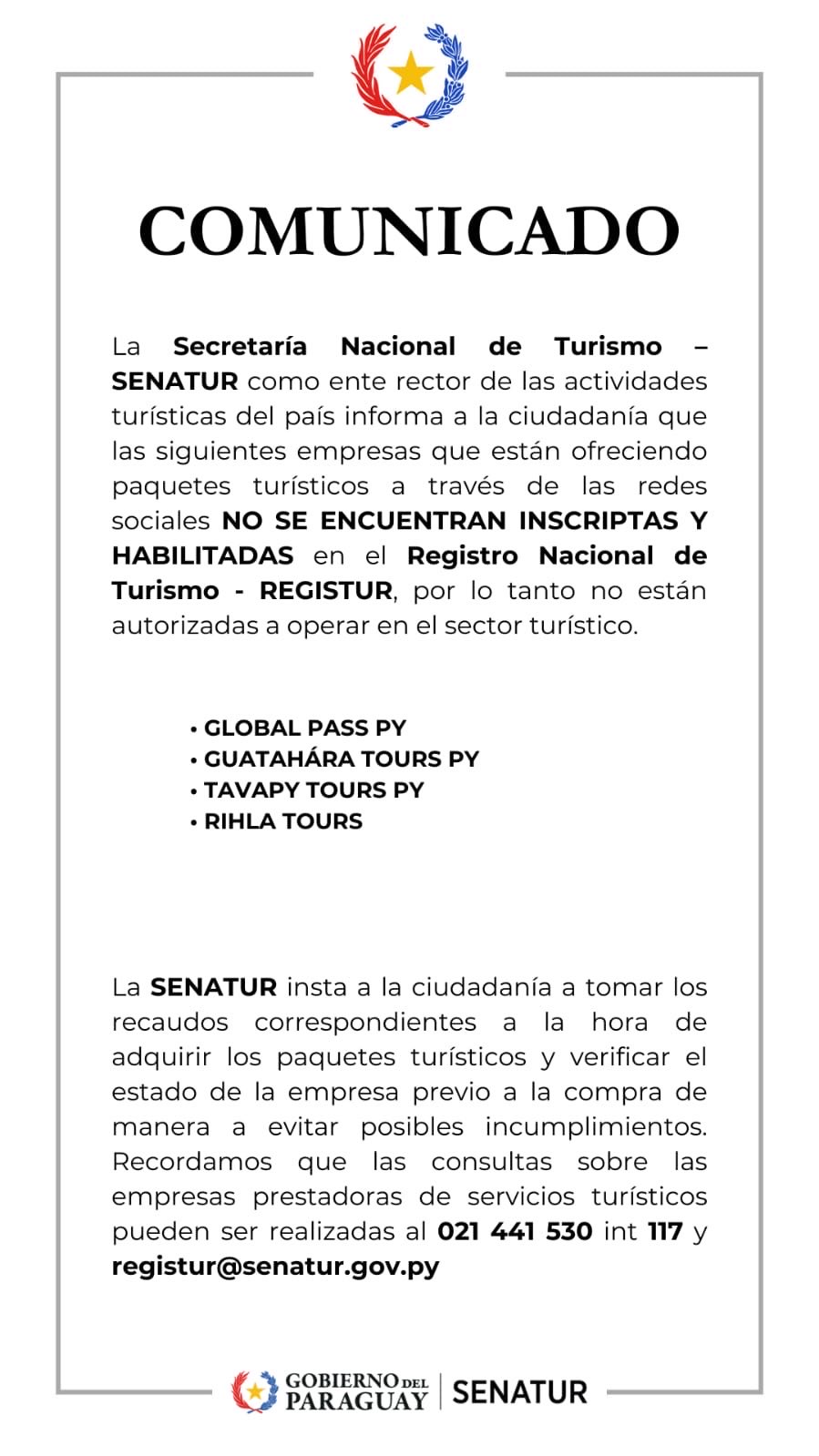 La Senatur informan que las siguientes empresas NO se encuentran inscriptas ni habilitadas en el Registro Nacional de Turismo (REGISTUR), informó este miércoles la directora de Fiscalización Turística de la Secretaría Nacional de Turismo, Marcela Villasanti.