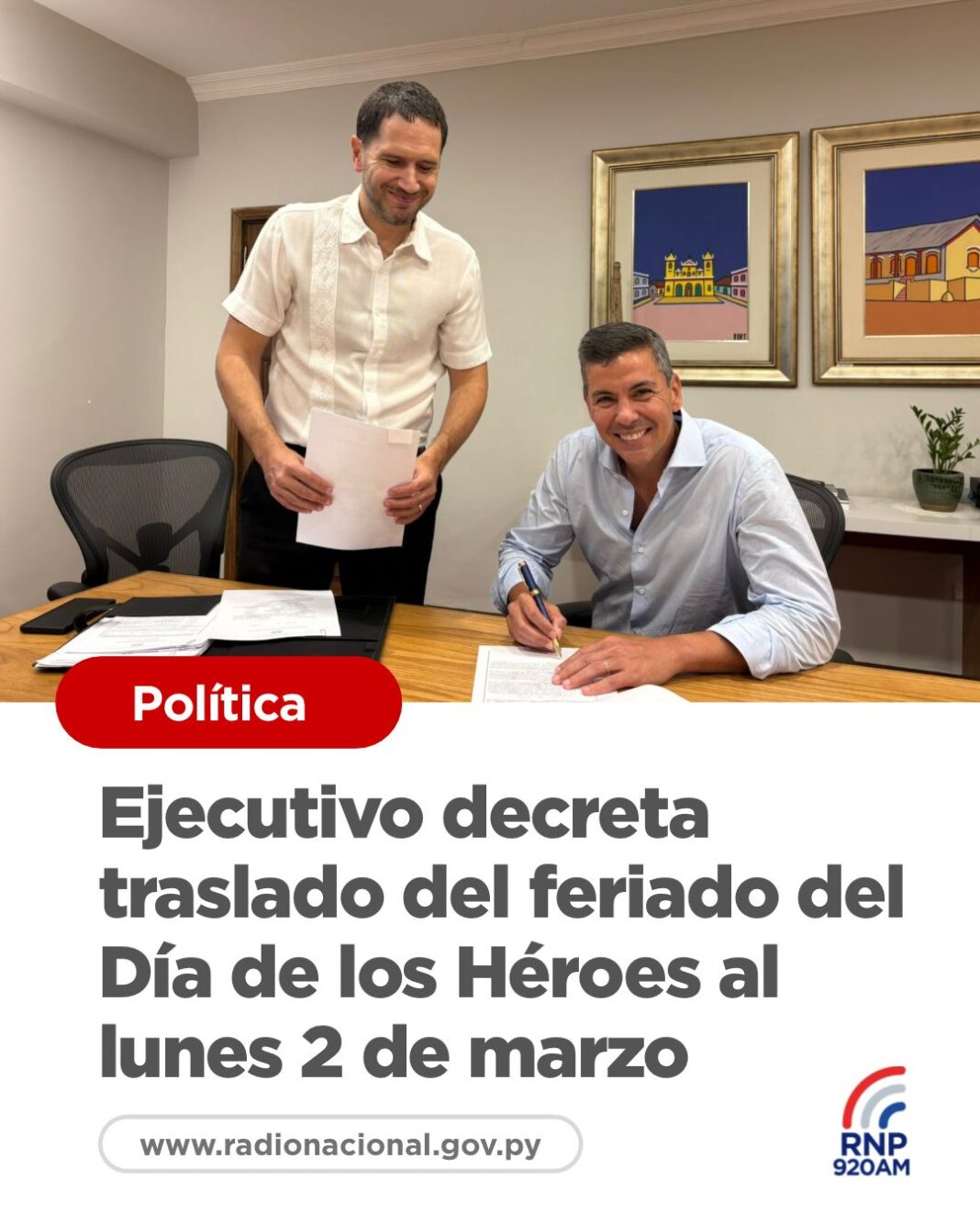 A través de la cuenta de X, el presidente de la República Santiago Peña, anunció que firmó el decreto N° 5508 que traslada el feriado del Día de los Héroes al lunes 2 de marzo.