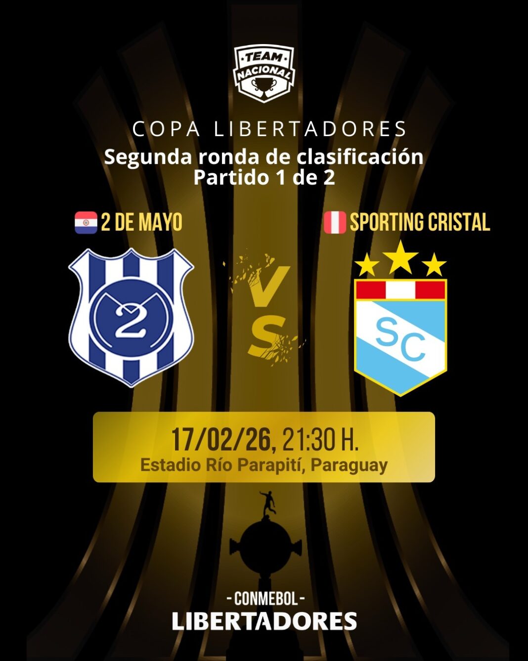 En juego de ida por la Fase 2 de la Libertadores el 2 de Mayo recibe en el Río Parapití de Pedro Juan Caballero al peruano Sporting Cristal.