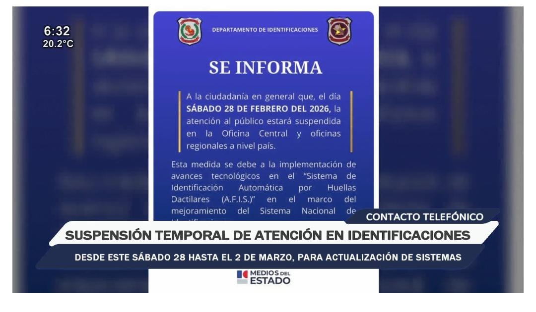 El Departamento de Identificaciones de la Policía Nacional informó que la atención al público quedará suspendida desde el sábado 28 de febrero hasta el lunes 2 de marzo, informó este jueves el jefe de la institución, comisario principal Alcides Duarte Arzamendia.
