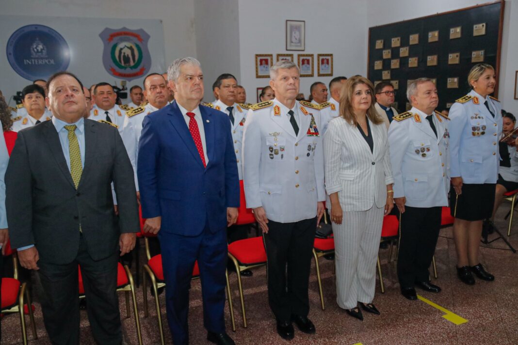 En un acto realizado este lunes, la Policía Nacional celebró 183 años de vida institucional y 29 años de la Radio La Voz de la Policía. Las autoridades nacionales y policiales, encabezado por el ministro del Interior, Enrique Riera, entregó reconocimiento al compromiso y la trayectoria en la institución a oficiales, suboficiales y personal civil del departamento de Relaciones Públicas, en el predio del Museo Mártires de la Policía Nacional.