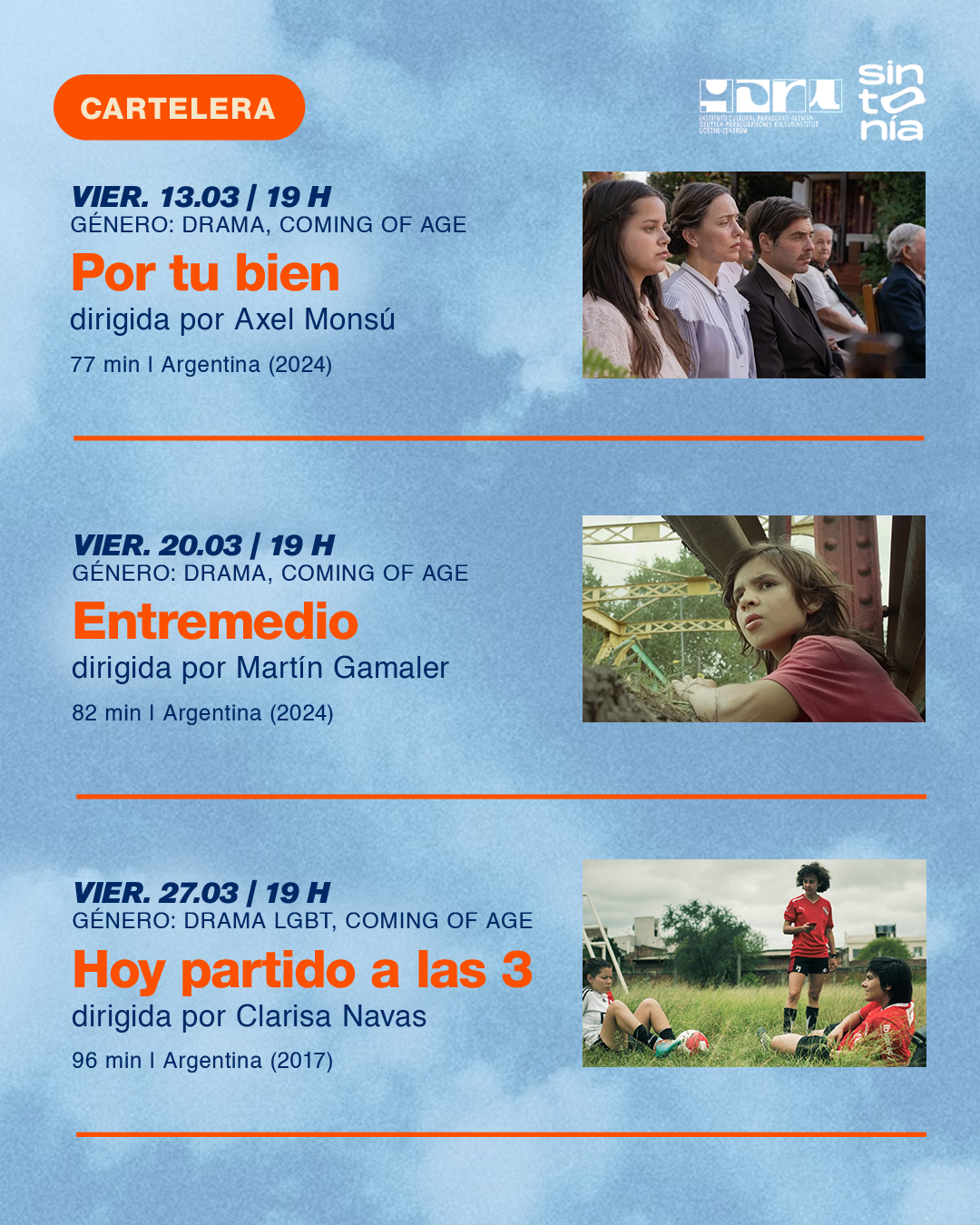 El Instituto Cultural Paraguayo-Alemán (ICPA-GZ) en colaboración con el cineasta Yosué Ayala y el medio especializado Sintonía, invitan al ciclo de cine, denominado «Crecer en los Suburbios», a realizarse los viernes 13, 20 y 27 de marzo.