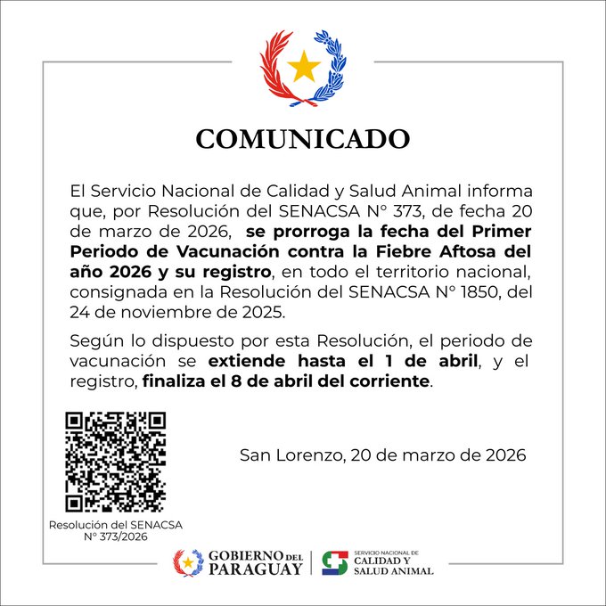 El Servicio Nacional de Calidad y Salud Animal, prorroga la fecha del primer período de vacunación contra la fiebre aftosa 2026, confirmó este martes el director de Sanidad del Senacsa, doctor Víctor Maldonado.