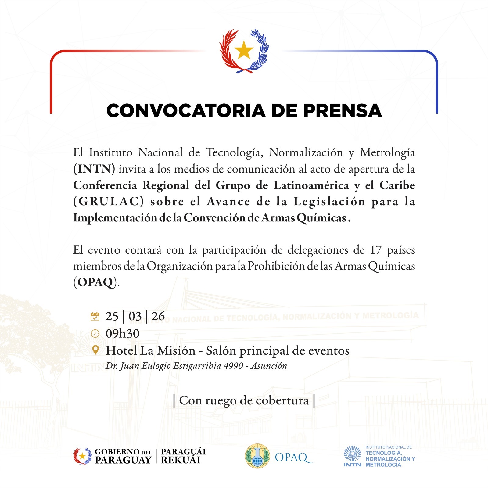 Delegaciones de 17 países se reunirán durante 3 días para una Conferencia Regional para América Latina y el Caribe, organizada por la OPAQ junto con el con el Instituto Nacional de Tecnología, Normalización y Metrología, destacó este miércoles la directora del INTN Lira Giménez.
