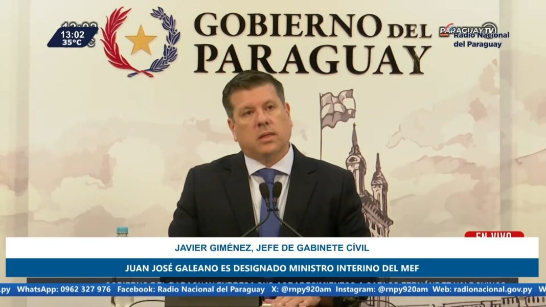 «El presidente de la República, Santiago Peña, ha dispuesto en la mañana de hoy, cambios en el Ministerio de Economía y Finanzas, en ese contexto Juan José Galeano, actual asesor económico de la Presidencia de la República, asume como ministro interino de la cartera» anunció este martes el jefe de Gabinete Civil, Javier Giménez.