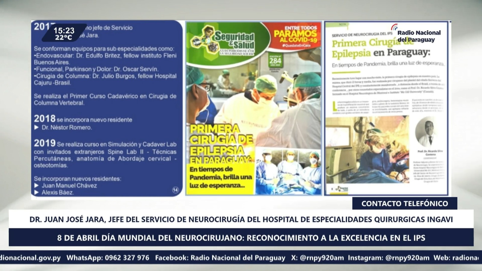 Destacó que en la actualidad, el IPS cuenta con un equipo de destacados neurocirujanos, entre ellos: Dr. Juan José Jara, jefe del servicio de Neurocirugía del Hospital de Especialidades Quirurgicas Ingavi, Dr. Oscar Servín, jefe del servicio de Neurocirugía del Hospital Central del IPS, Dr. Ready Simon, especialista en cirugía de columna, base de cráneo y nervios periféricos, Dr. Oscar Arturo Servín Moreno, especialista en cirugía de Parkinson y epilepsia, Dr. Elio Arnaldo Marín Sanabria, destacado por su aporte científico, Dr. Edulfo Brítez, reconocido por su trayectoria en neurocirugía, Dr. Hermes González, Dr. Julio Burgos, Dr. Cristhian Legal y Dr. Alexis Báez, parte del equipo de alto nivel del Hospital Central.