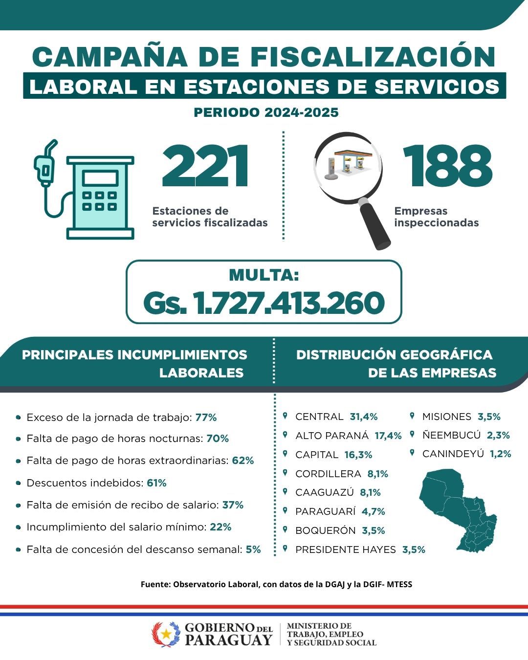 El Ministerio de Trabajo, Empleo y Seguridad Social, desplegó una campaña intensiva de fiscalización en estaciones de servicio a nivel país durante el periodo 2024–2025, con un total de 221 establecimientos inspeccionados, correspondientes a 188 empresas, destacó este lunes el director general de Asesoría Jurídica del MTESS, Danilo Sanabria.